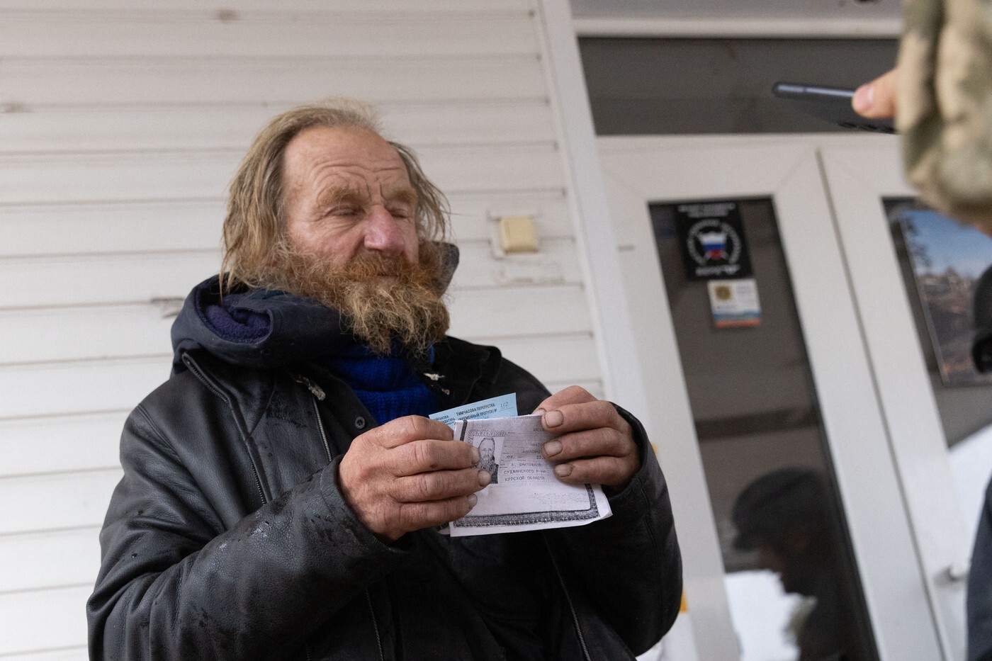 Фото: Беженец из Суджанского района Курской области показывает документы военному перед входом в пункт приёма беженцев. Октябрь 2024 года. Profimedia