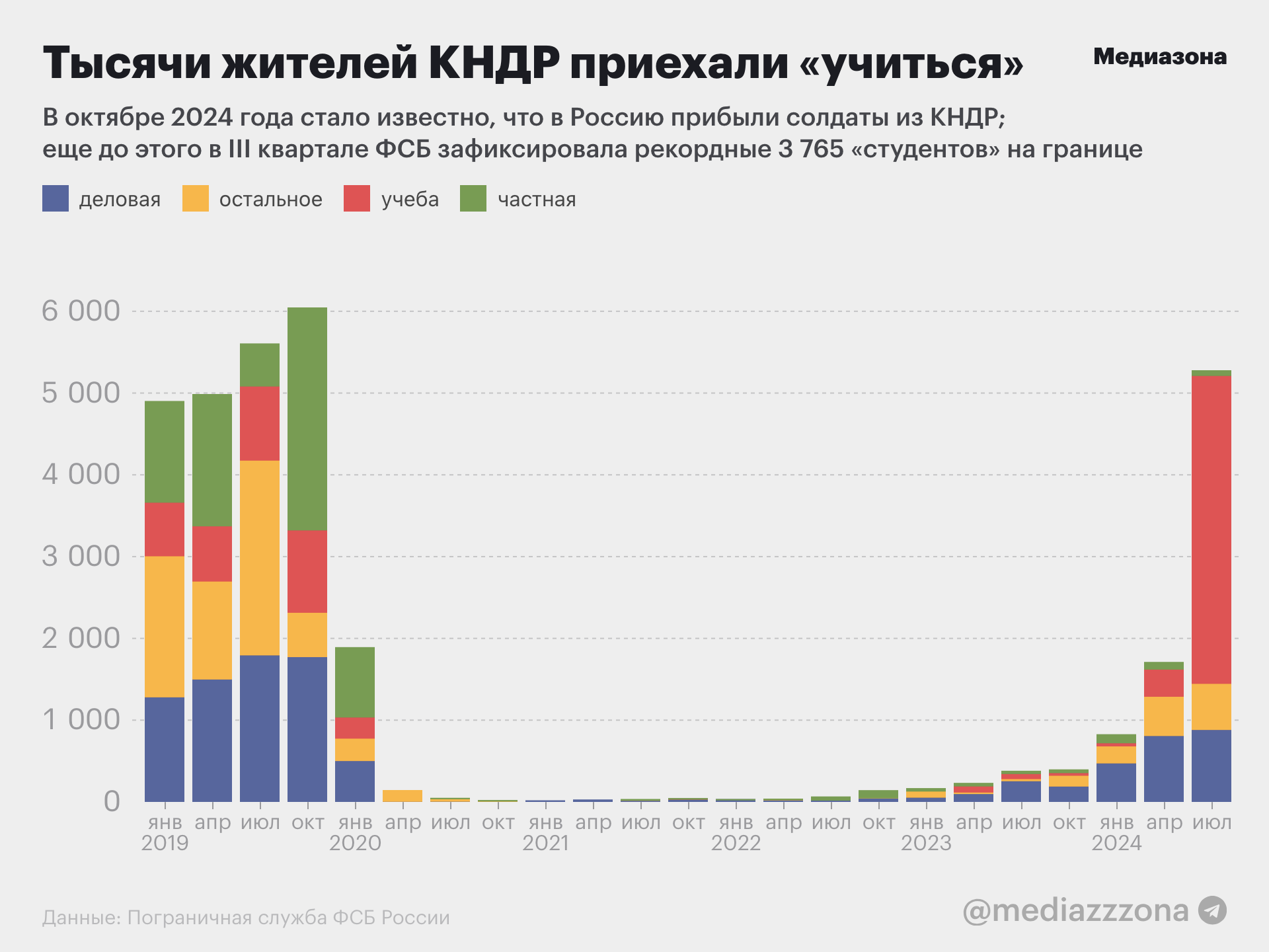 По данным пограничников, 3 765 северокорейцев с июля по сентябрь приехали в Россию учиться. Для сравнения, за весь доковидный 2019 год учащихся было всего 3,2 тысячи человек.