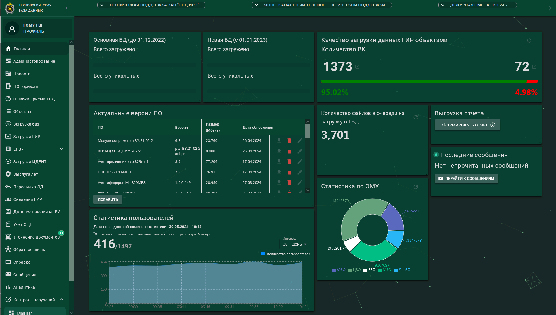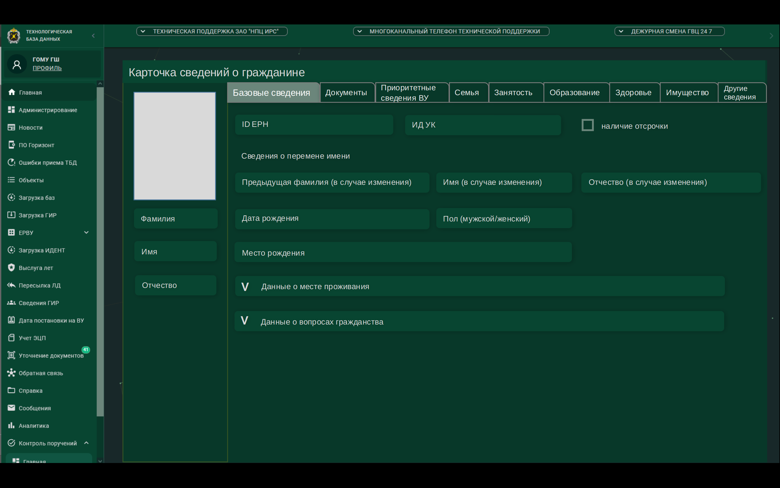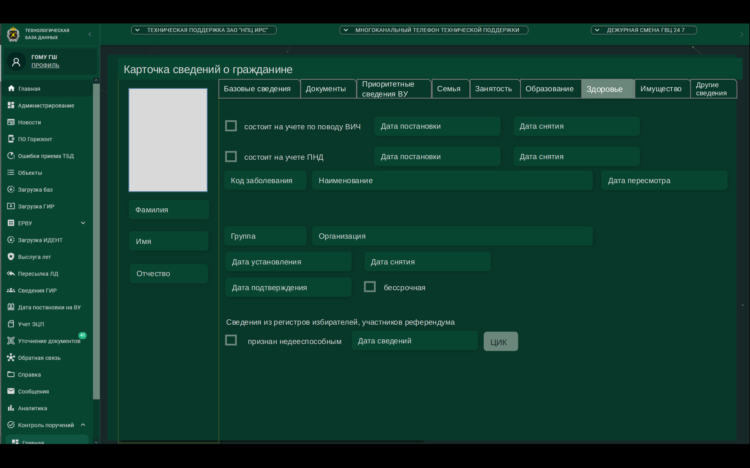 Это некая технологическая база данных Главного организационно-мобилизационного управления Генштаба (в левом верхнем углу изображена эмблема ГОМУ ГШ). Сверху справа в раскрывающемся меню должна быть информация о дежурной смене Главного вычислительного центра. Техническую поддержку работы этой базы данных оказывает ЗАО «НПЦ ИРС».