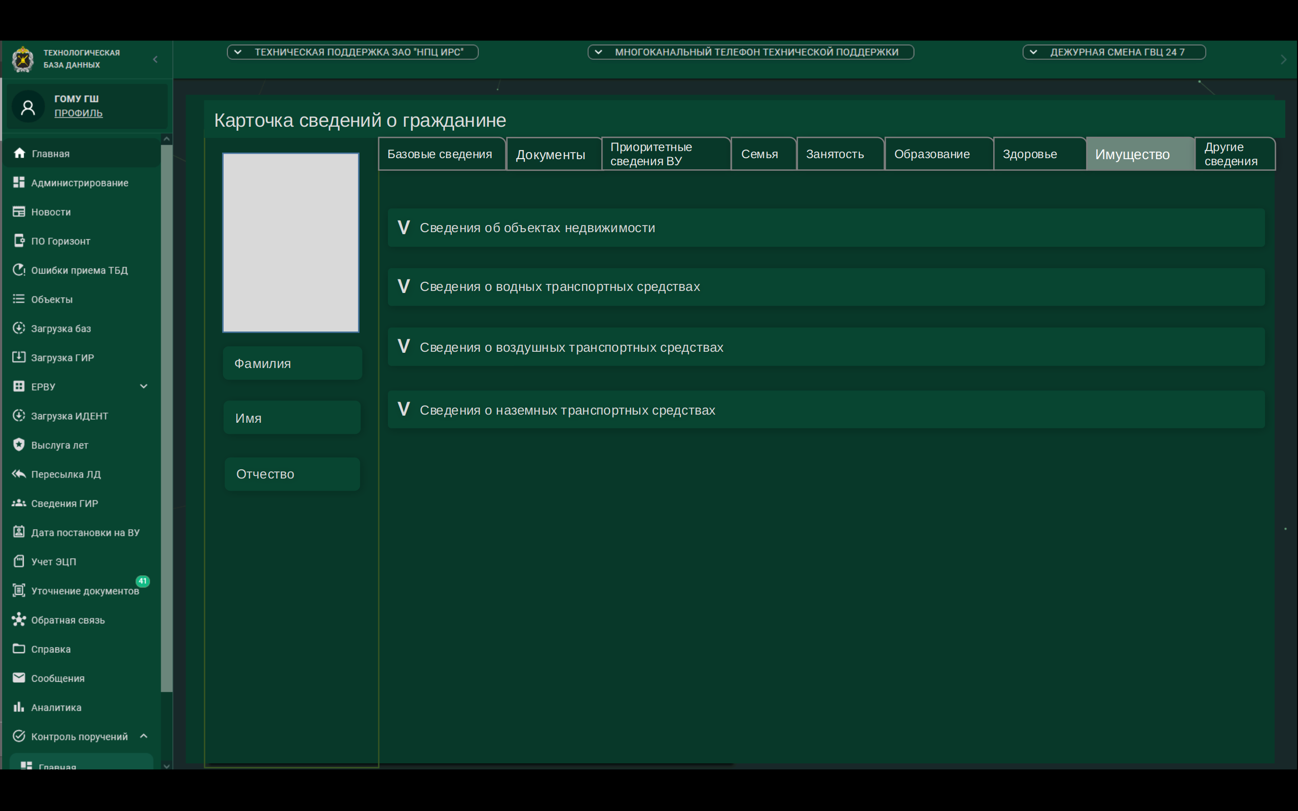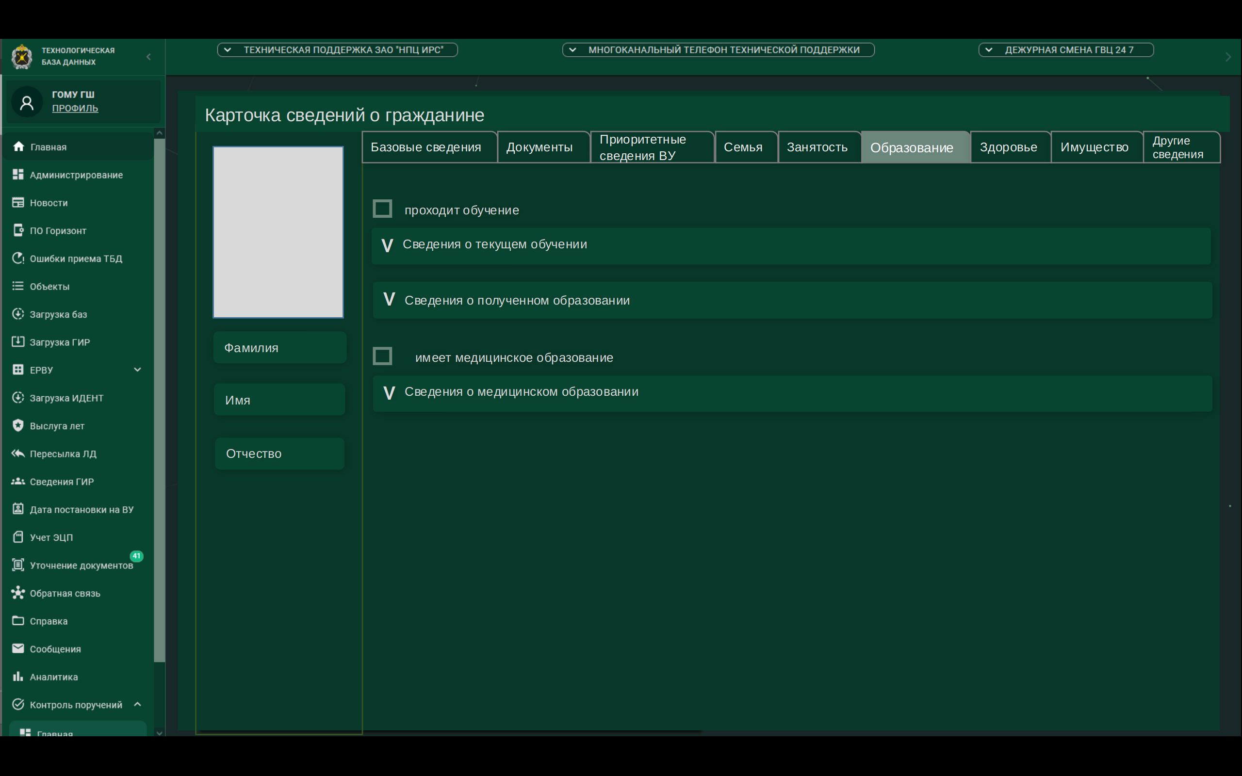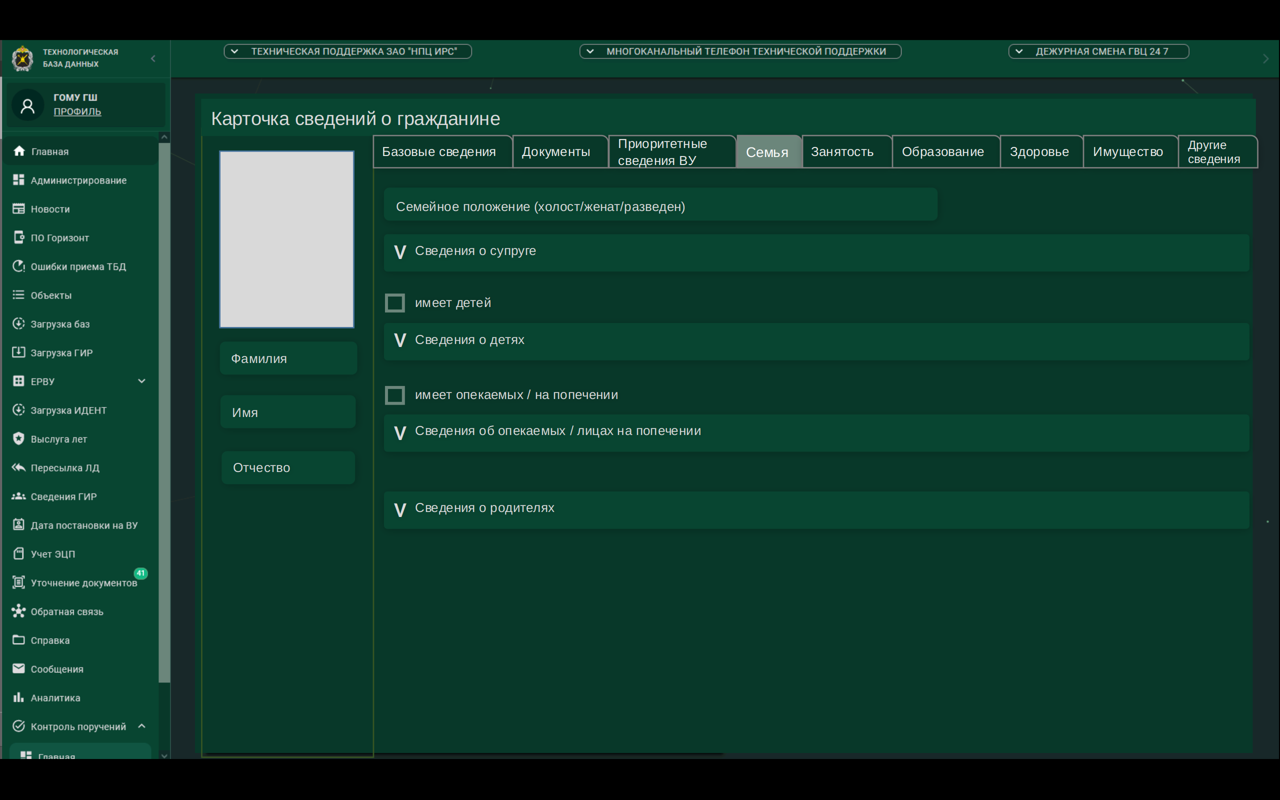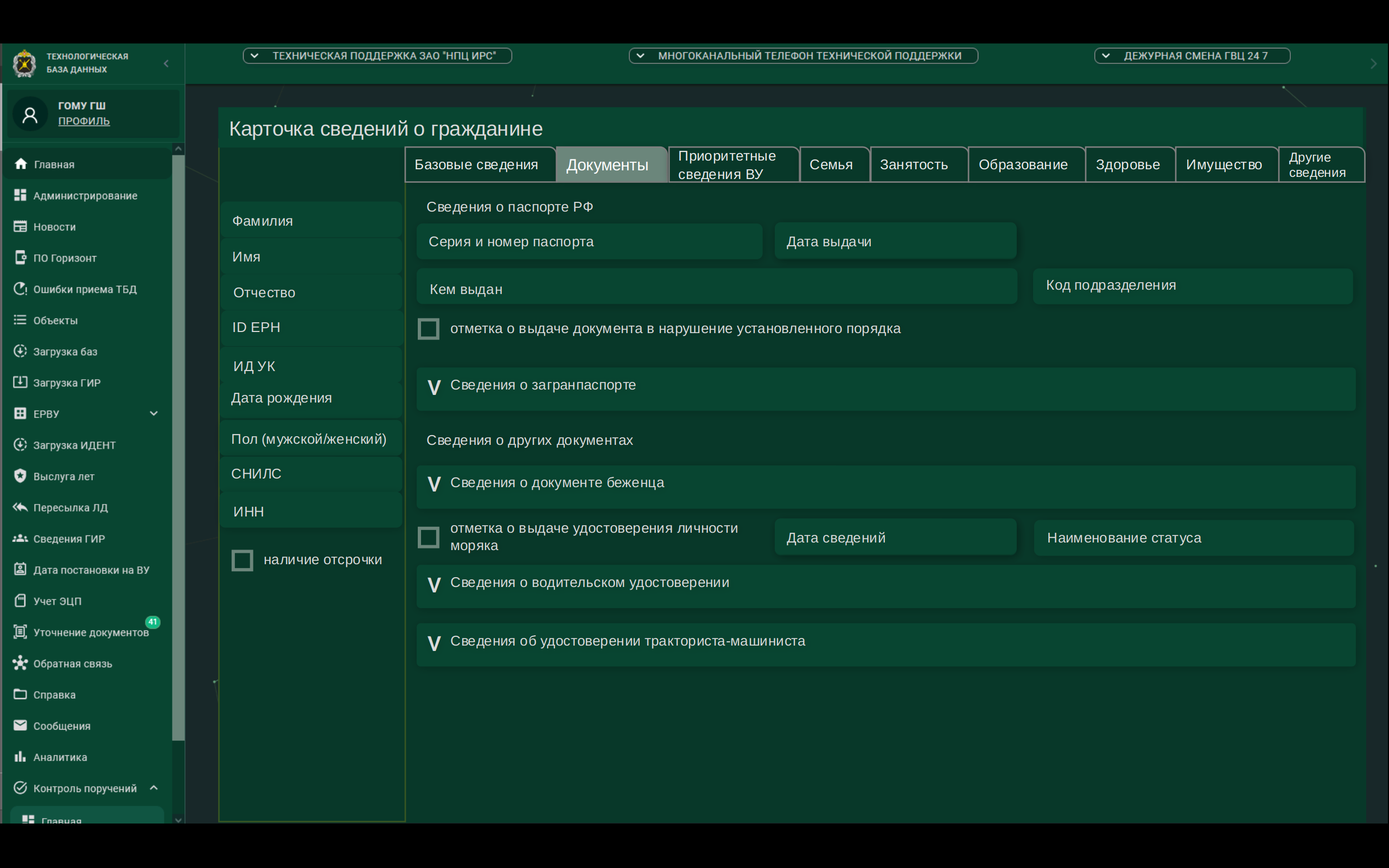 Это некая технологическая база данных Главного организационно-мобилизационного управления Генштаба (в левом верхнем углу изображена эмблема ГОМУ ГШ). Сверху справа в раскрывающемся меню должна быть информация о дежурной смене Главного вычислительного центра. Техническую поддержку работы этой базы данных оказывает ЗАО «НПЦ ИРС».