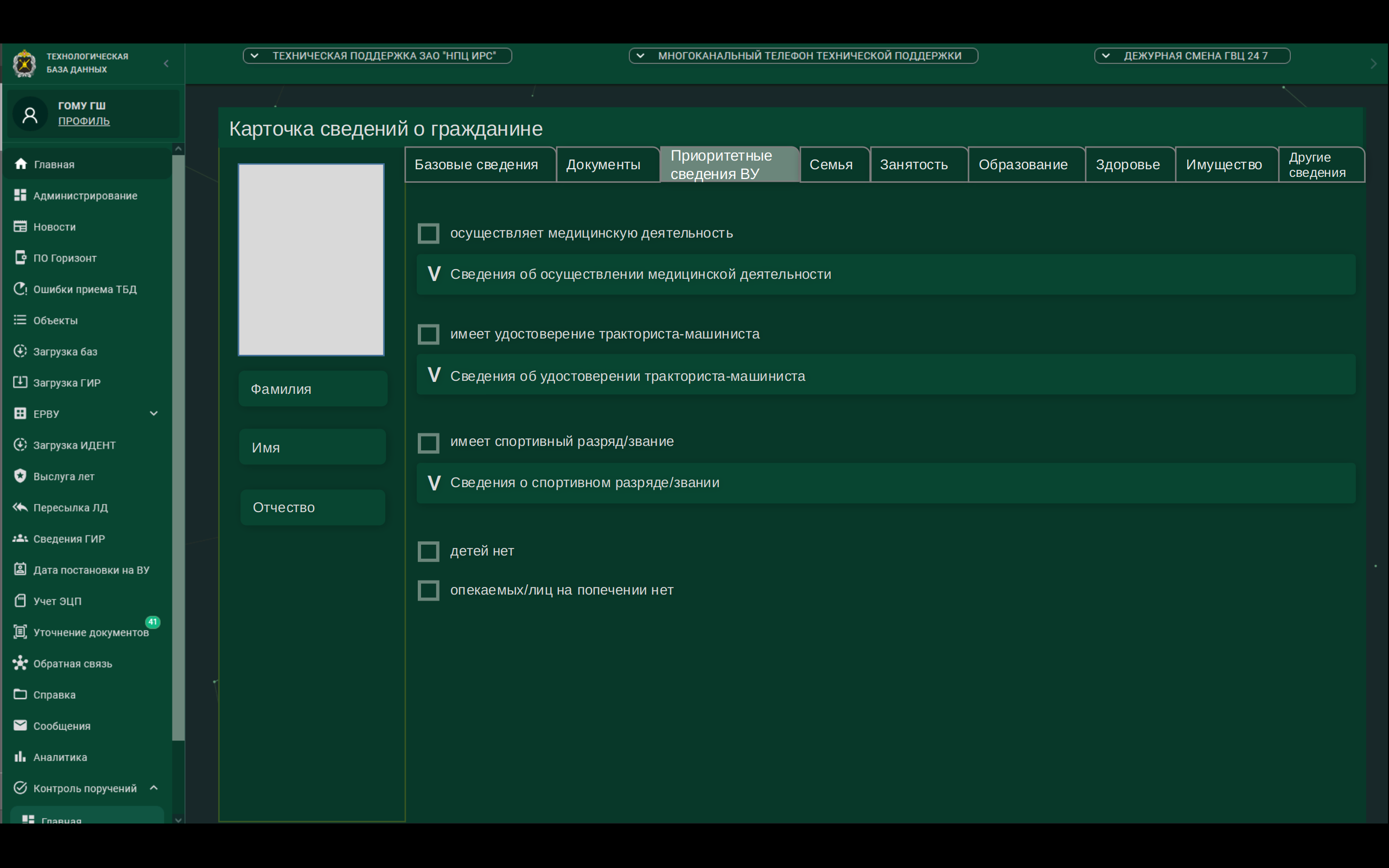 Среди всех вкладок стоит особо выделить третью — «Приоритетные сведения ВУ». Вся содержащаяся в ней информация продублирована в других местах карточки. Сведения об осуществлении медицинской деятельности — во вкладке «Занятость». О наличии удостоверения тракториста-машиниста — во вкладке «Документы». О наличии спортивного разряда или звания — во вкладке «Другие сведения». Об отсутствии детей и опекаемых лиц — во вкладке «Семья».
