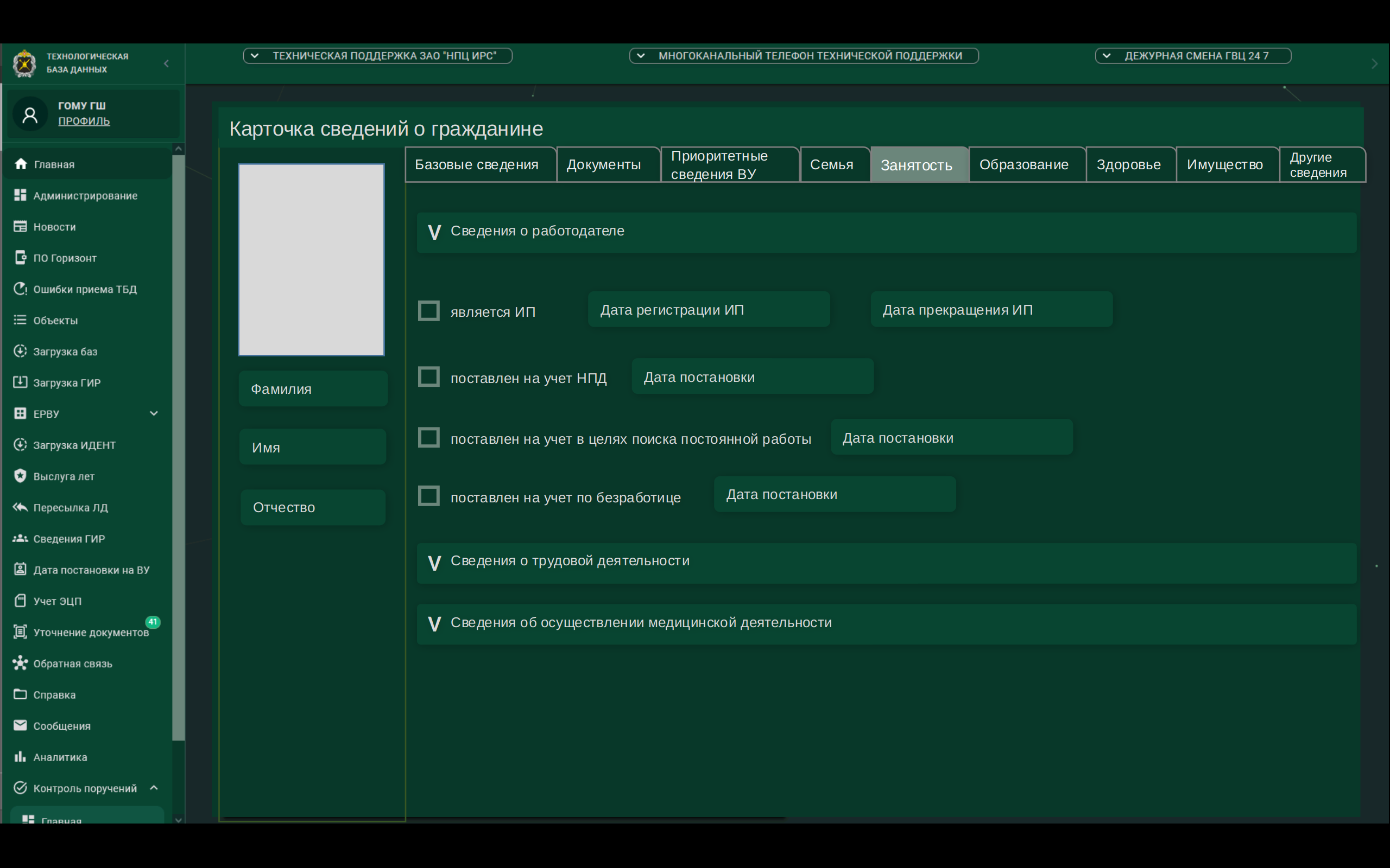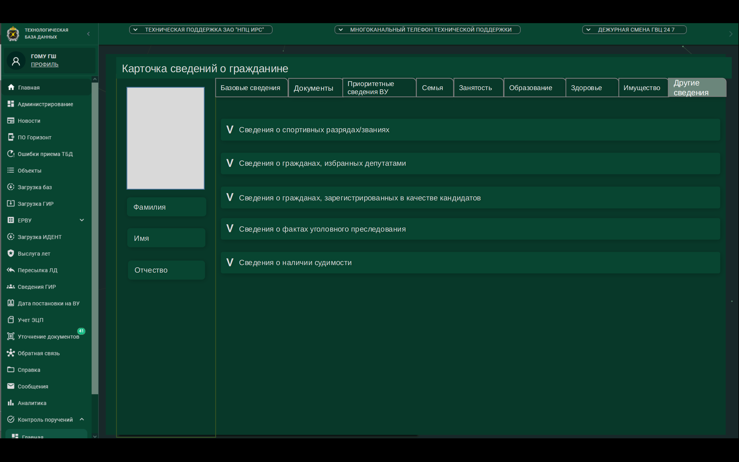 В презентации у карточки сведений о гражданине есть девять вкладок: