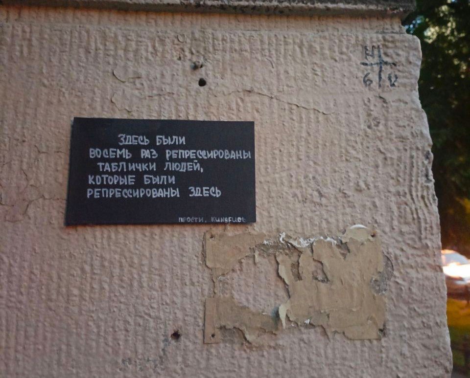 Что касается табличек, то это просто то, что попалось мне на глаза. Я регулярно ходил и бегал мимо Дома специалистов на Лесном проспекте, 61, видел, как табличек становилось больше, делал фотографии. Видел, как этот проект живет, несмотря на войну, видел, что память существует. Я искренне верю, что чем больше будет памятных мест, посвященных репрессиям, тем меньше будет репрессий в нашей жизни.