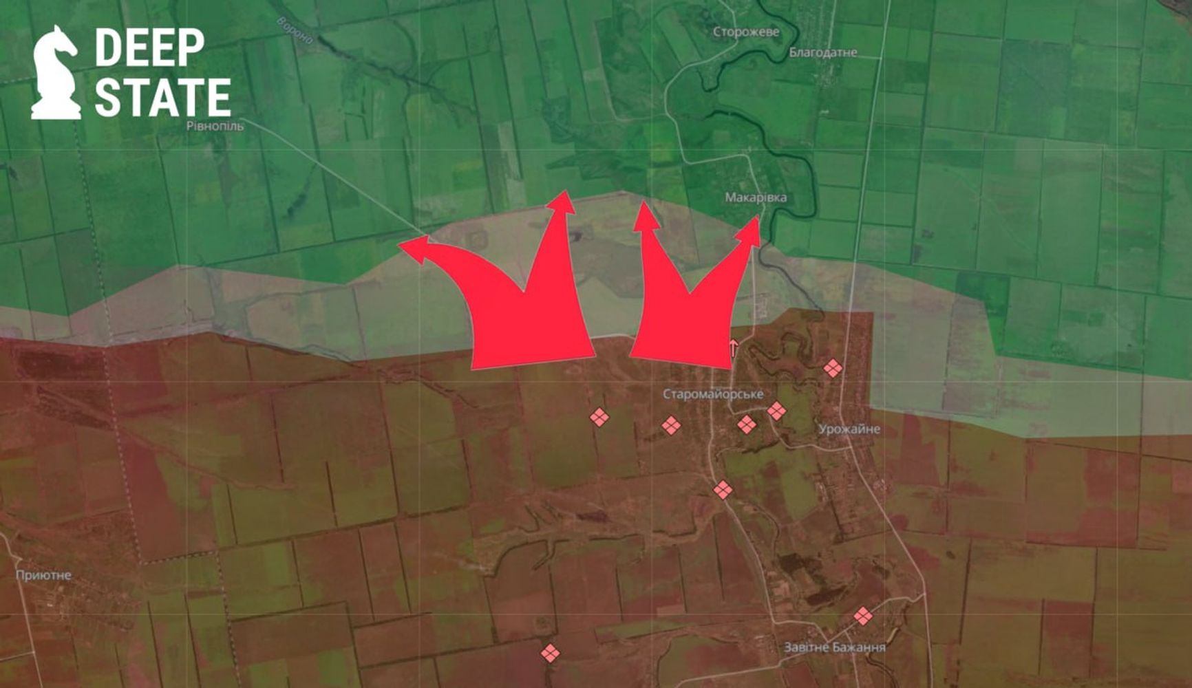 Что касается других участков фронта, то DeepState фиксирует продвижение ВС РФ в Першотравневом на купянском направлении, Нелеповке под Торецком (до 2016 года — Дзержинск), около Петровки, Юрьевки и Новоалексеевки на покровском направлении, Дальнего под Кураховом, а также Макаровки, Ровнополя и Новодаровки на Времевском выступе.