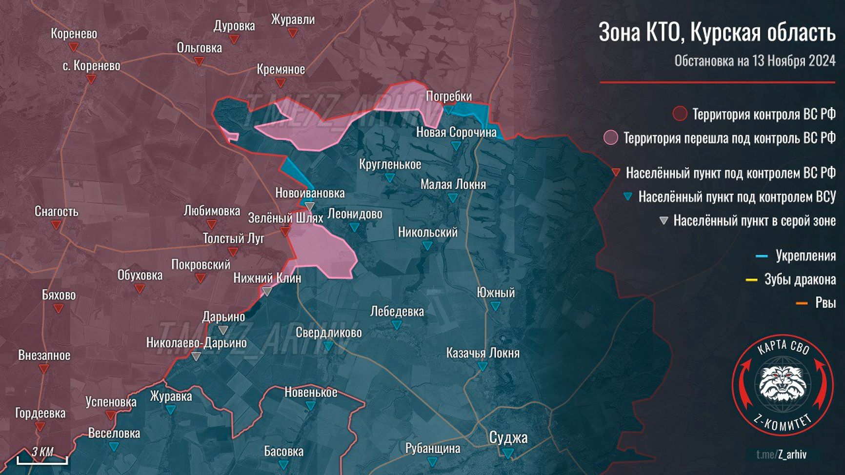 На карте «Z комитет + карта СВО» пророссийское OSINT-сообщество отмечает продвижение в районах Новоивановки, Погребков и Зелёного Шляха.