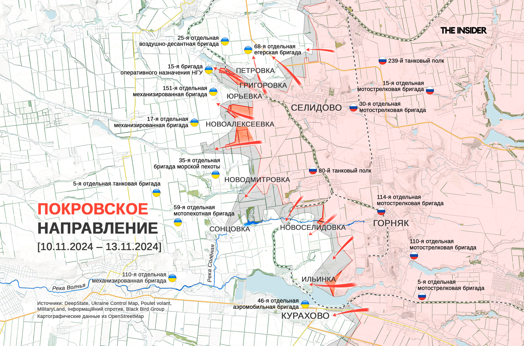 DeepState сообщает, что ВС РФ добились успехов около Колесниковки, Синьковки и Лимана Первого на купянском направлении, Новодаровки к западу от Времевского выступа, Дальнего южнее Курахова и в самом Курахове, Новоселидовке, Ильинке, Юрьевке и Пустынке на покровском направлении.