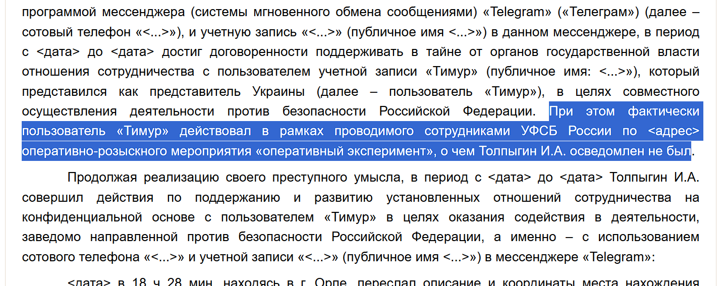 После публикации решения по делу орловчанина стало известно, что он в телеграме общался с пользователем «Тимур», который называл себя представителем Украины. При этом в действительности «Тимуром» был сотрудник ФСБ, действовавший в рамках «оперативного эксперимента».