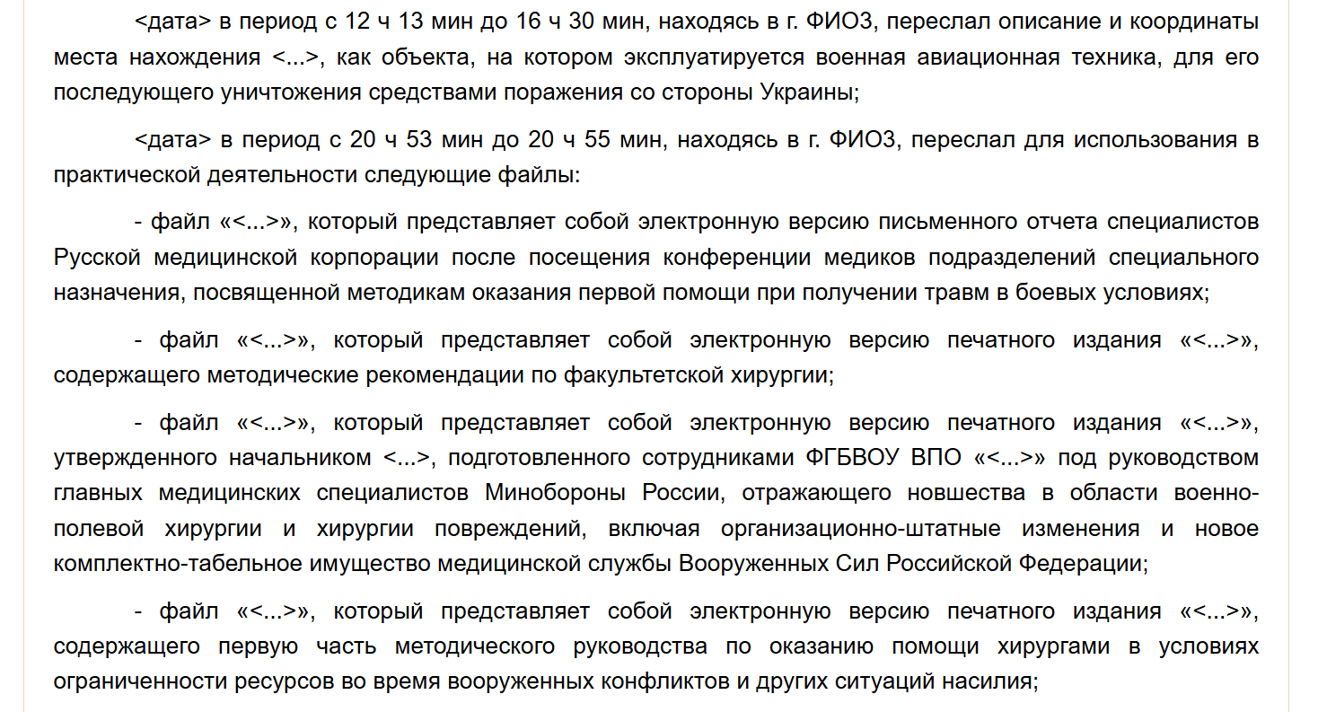 В дальнейшем Толпыгин поддерживал общение с «Тимуром» и передавал ему разную информацию «в целях оказания содействия в деятельности, заведомо направленной против безопасности Российской Федерации». В частности, он передал координаты нескольких предприятий и военных объектов, а также медицинскую литературу — например, методическое руководство по оказанию помощи во время войны для хирургов.
