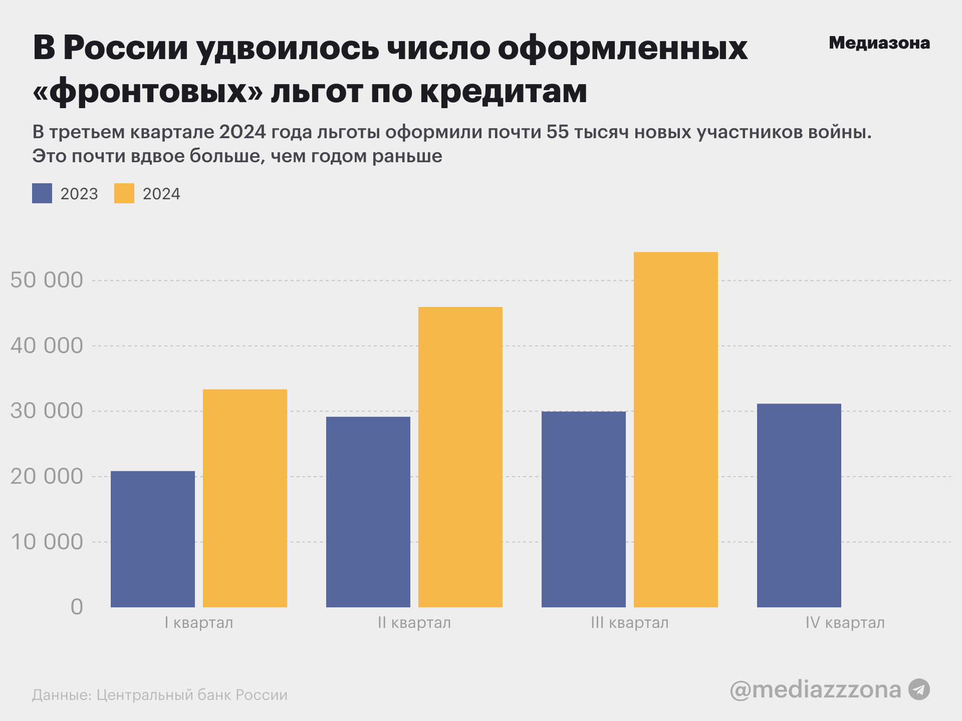 Только с июля по сентябрь банки оформили 54,2 тысяч новых кредитных каникул для участников вторжения в Украину (включая контрактников и мобилизованных), то есть почти вдвое больше, чем за аналогичный период предыдущего года.