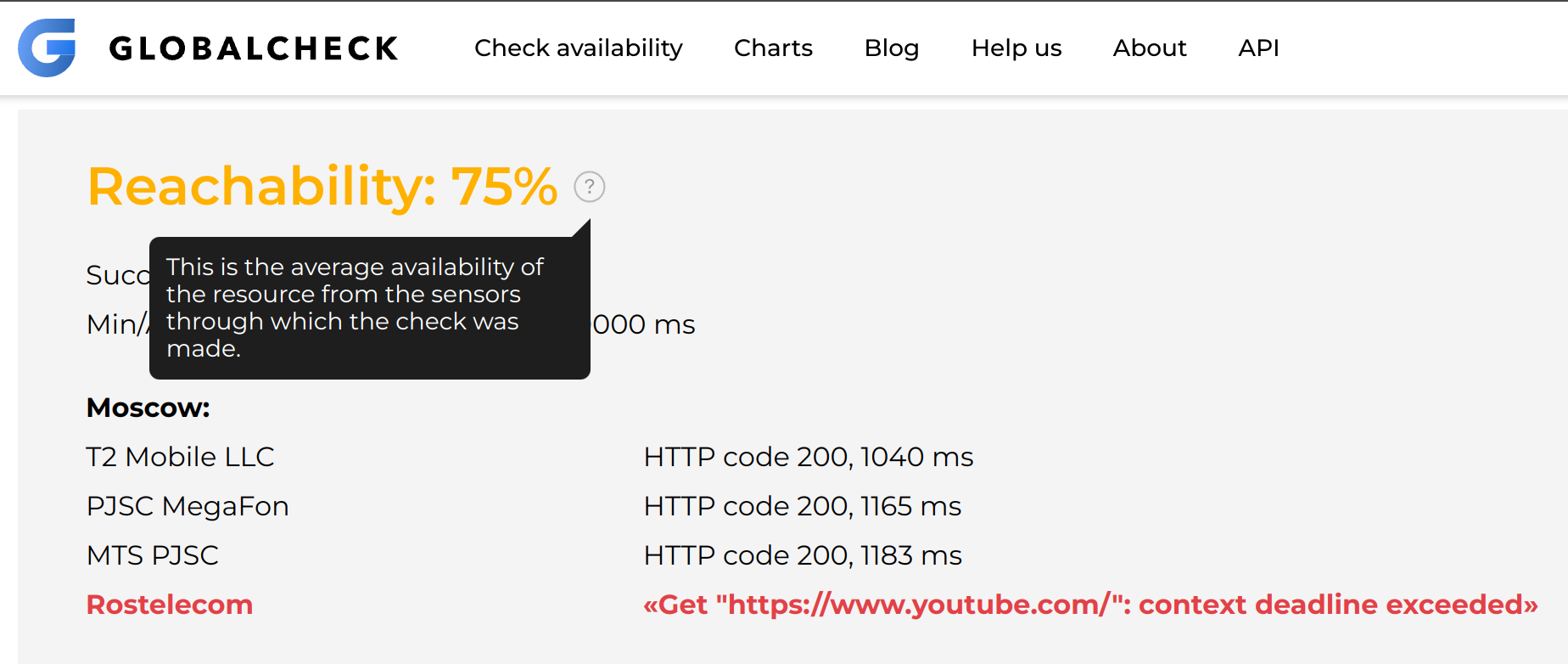 При показателе доступности в 0% GlobalCheck поможет понять, что ютьюб полностью заблокировали у всех операторов по всей стране. Стабильная же доступность в 100% на протяжении длительного времени будет означать не отмену искусственного замедления, а только то, что сайт сервиса стал открываться у всех операторов, где стоят сенсоры GlobalCheck.