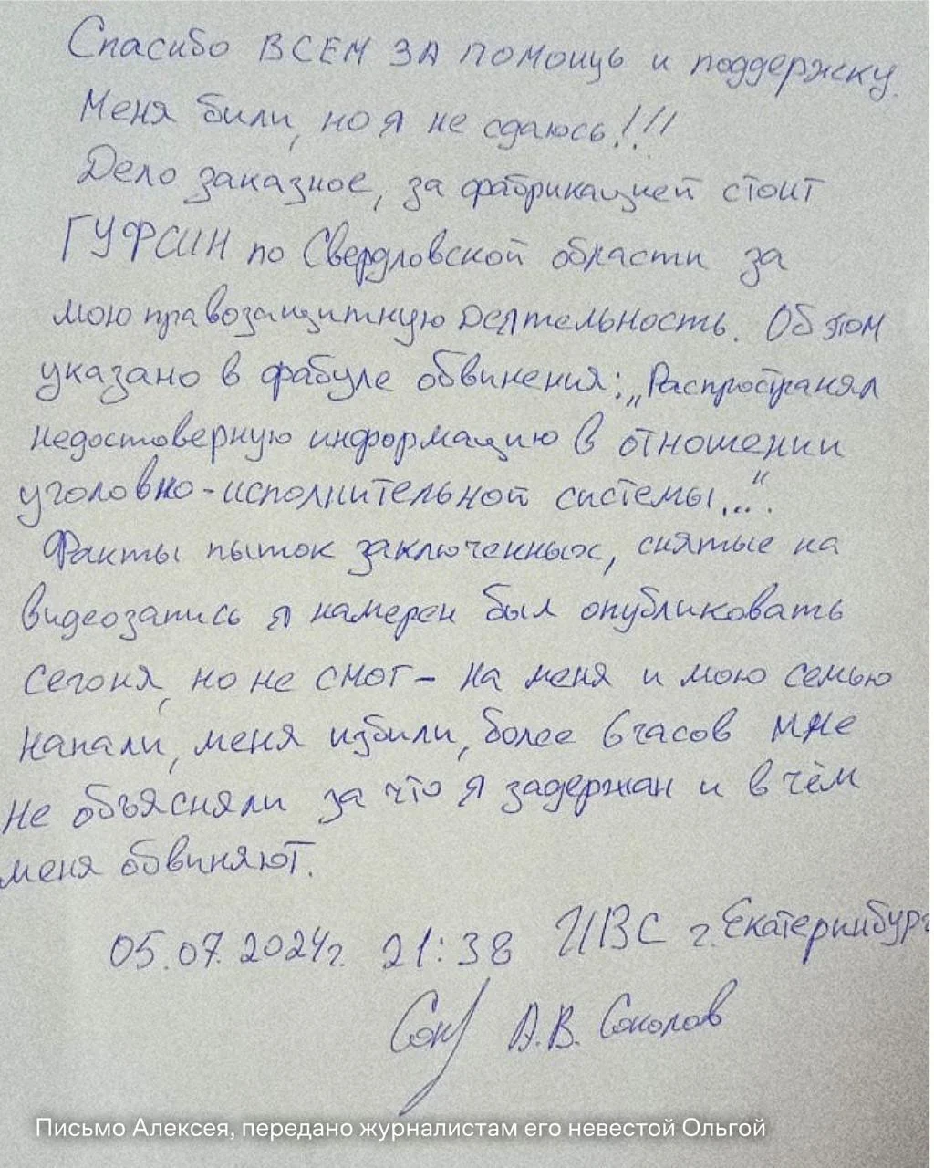 Письмо из СИЗО Екатеринбурга от правозащитника Алексея Соколова, арестованного за логотип «запрещенной» соцсети