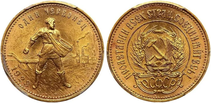 Ясно, что «золотой червонец» — некий символ устойчивой государственной валюты, обеспечиваемый золотым запасом страны. Ну а все-таки: была такая монета — золотой червонец? Была. Выпустили ее в 1923 и 1925 годах в очень небольшом количестве из золота высокой пробы.