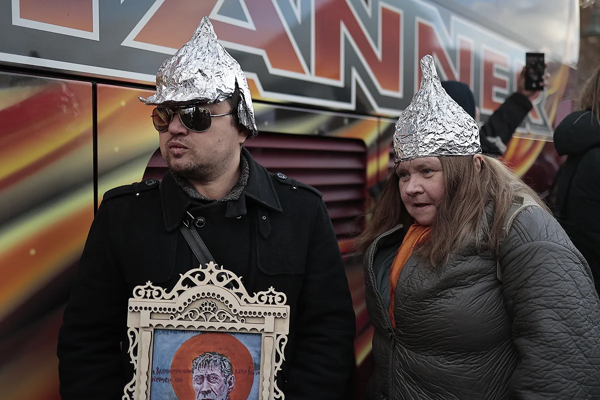 Перед этим я снова увидел — уже в марширующем строю — вдову Пятигорского в шапочке из фольги и прибившегося к ним мужчину в тельняшке цветов георгиевской ленточки и пиджаке с многочисленными пивными крышками в виде орденов и медалей. Они, по словам карикатуриста Семена Скрепецкого, символизировали любовь русских к пафосу и наградам.