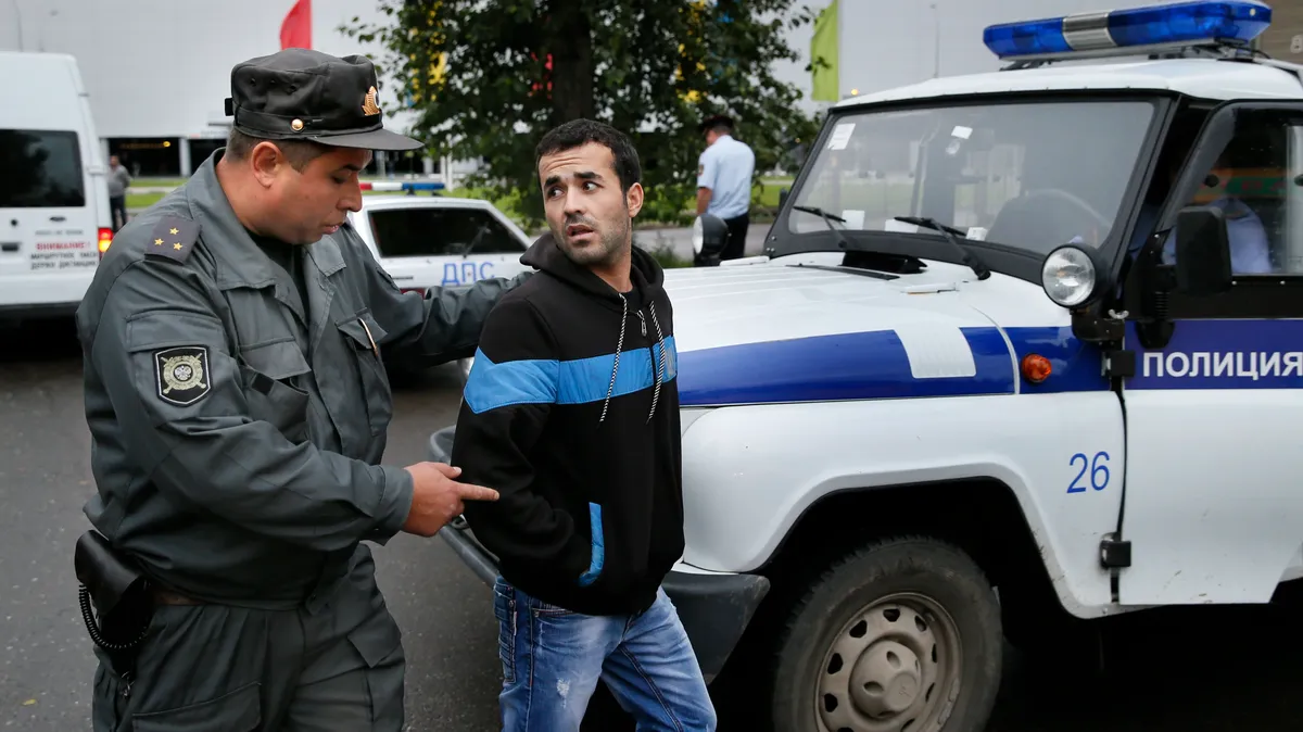 An alleged illegal migrant is detained by police during a raid in the outskirts of Moscow. Photo: EPA/YURI KOCHETKOV