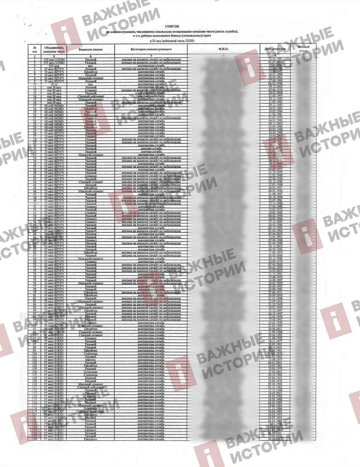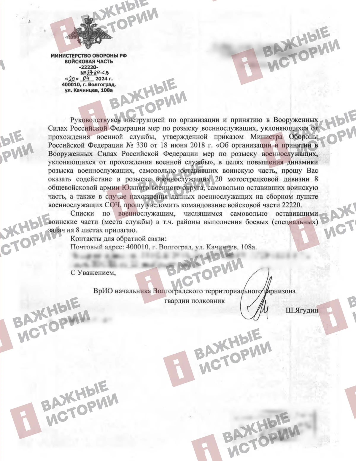How we verified the listThe document in our disposal is a list titled “Military personnel listed as having unauthorizedly left their units (places of service), including locations where combat (special) tasks were being carried out” from the 20th Motorized Rifle Division. The list includes 1,010 individuals with full names, dates of birth, military ranks, and other details. The document is signed by Acting Head of the Volgograd territorial garrison, Guards Colonel Shamil Yagudin (whose identity we have verified). The list was compiled no later than April 2024. For the safety of our source, we are not publishing the document or disclosing further details about its origin.