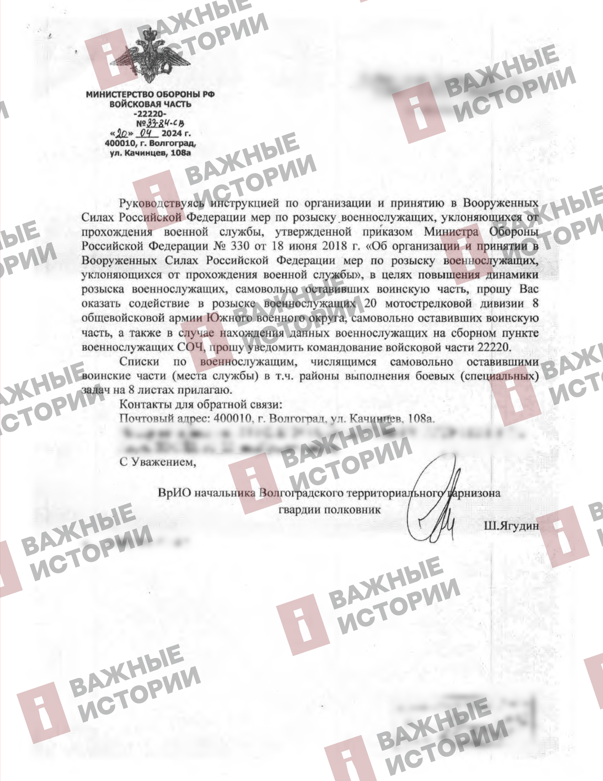 Как мы верифицировали списокДокумент, который оказался в нашем распоряжении, — это список «военнослужащих, числящихся самовольно оставившими воинские части (места службы), в том числе места выполнения боевых (специальных) задач» 20-й мотострелковой дивизии. В списке — 1010 человек, у которых указаны Ф. И. О., даты рождения, воинские звания и другие детали. Документ подписан врио начальника Волгоградского территориального гарнизона гвардии полковником Шамилем Ягудиным (его личность мы верифицировали). Список составлен не позднее апреля 2024 года. Мы не публикуем полный документ и не раскрываем подробности об источнике в целях его безопасности.