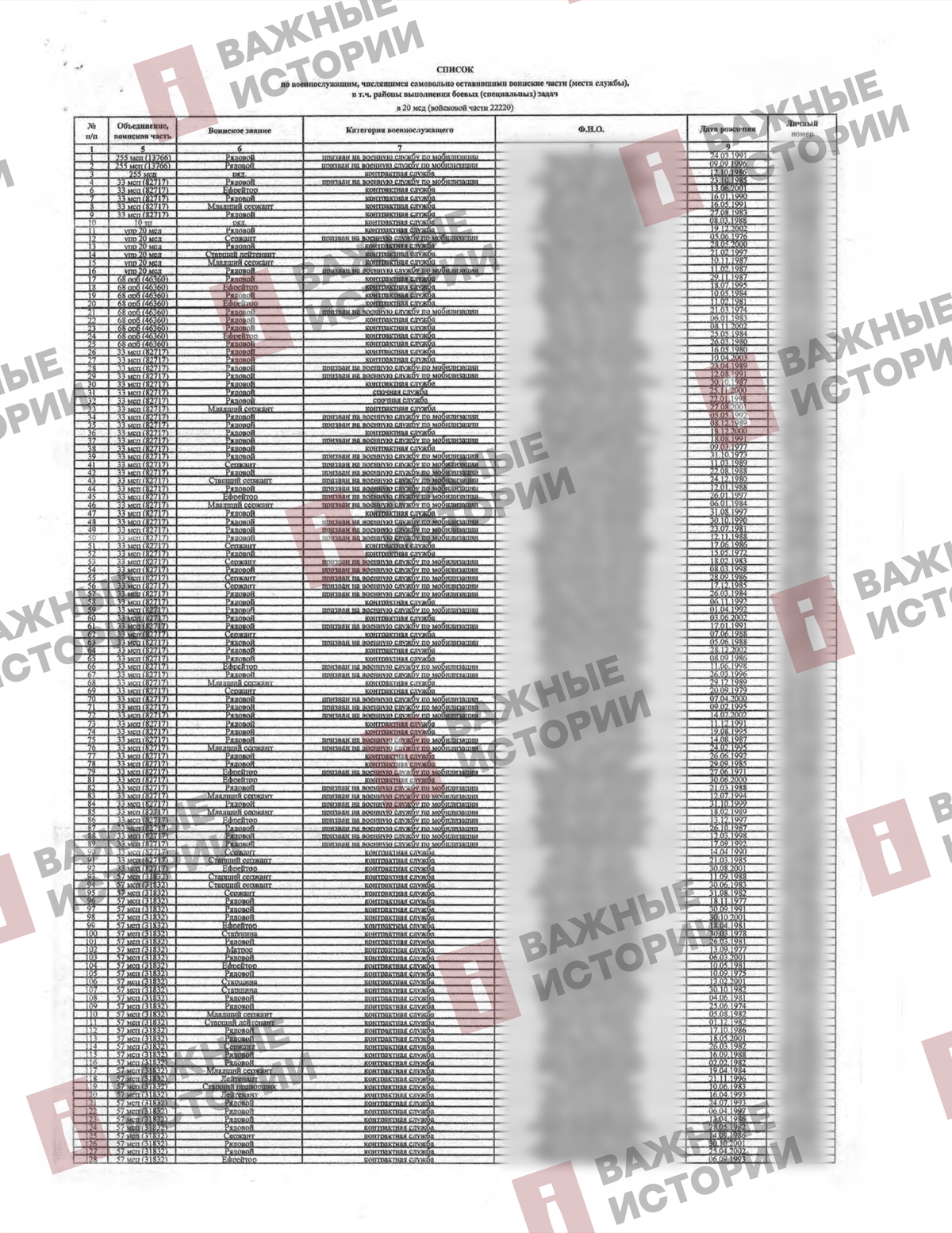 Нам удалось получить от другого независимого источника реестр боевого и личного состава 20-й дивизии на весну 2022 года. 31 человек из списка дивизии совпал по Ф. И. О. с военнослужащими из списка СОЧ. Остальные «сочники», скорее всего, были добавлены в штат уже после весны 2022 года — дивизия была сильно недоукомплектована и на начало полномасштабной войны там было больше тысячи вакантных должностей.