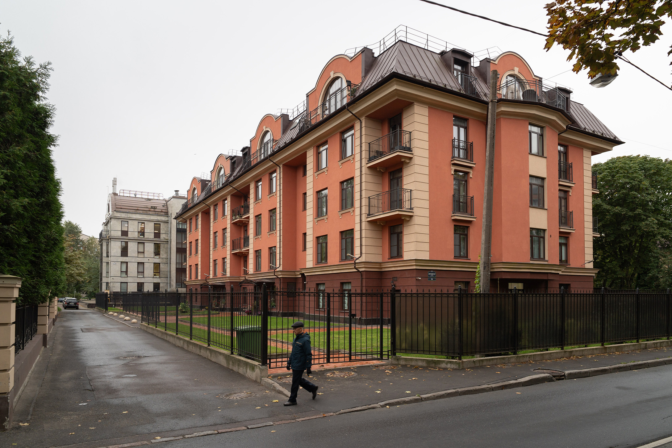 Дибуновская, 34 — это пятиэтажный клубный дом 2018 года постройки. Он выделяется на фоне 2-3-этажных немецких коттеджей этого района и цветом, и классом. В доме стометровые квартиры с балконами, у него есть своя территория, ограниченная решеткой. Квартиры в нем были в свободной продаже, рассказал «Бумаге» владелец одной из них Дмитрий.