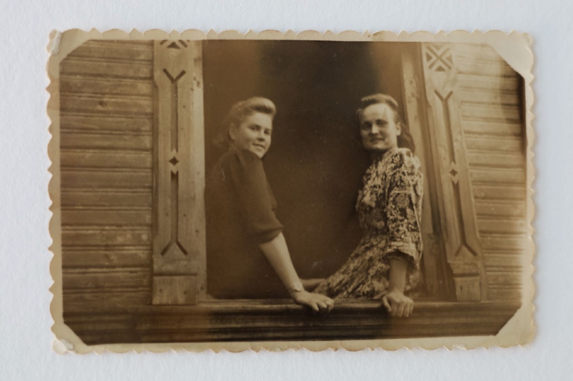 Эльвира Каупонен с подругой на подоконнике своего дома, 1923 года постройки. 1950-е. Деревня Истинка, Ленинградская область, Россия. Фото: семейный архив семьи Каупонен.