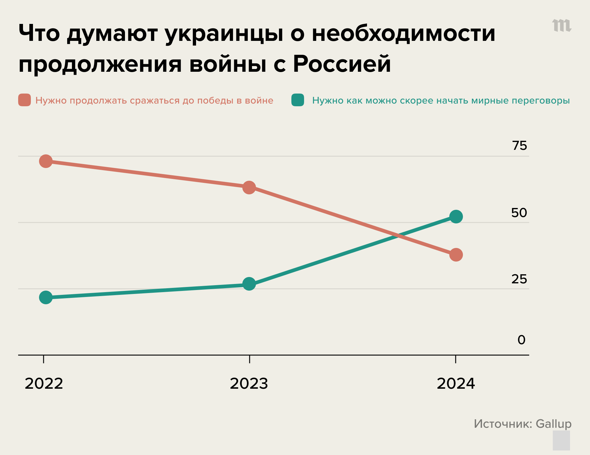 В самом начале войны о необходимости вести боевые действия до победы говорили 73% украинцев, в 2023 году — 63%. Как отмечает Gallup, в 2024 году не осталось ни одного региона страны, где поддержка продолжения боевых действий превышала бы 50%. Наибольший рост количества людей, выступающих за скорейшее начало мирных переговоров, был зафиксирован в центральных и западных областях, далеких от линии фронта.