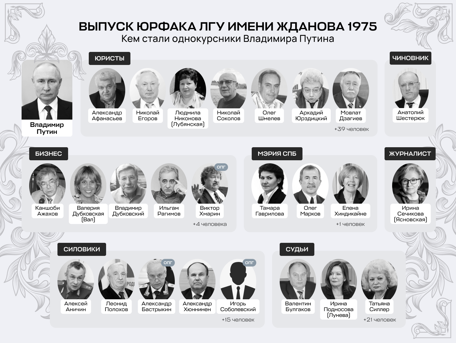 Выпуск юрфака ЛГУ 1975 года включает десятки людей с блестящей карьерой, сделанной в годы президентства или премьерства Владимира Путина.