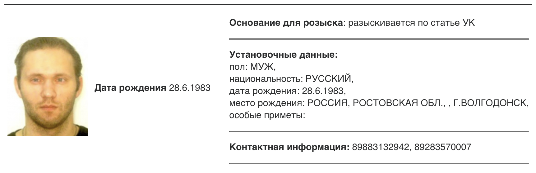 Скриншот из базы розыска МВД