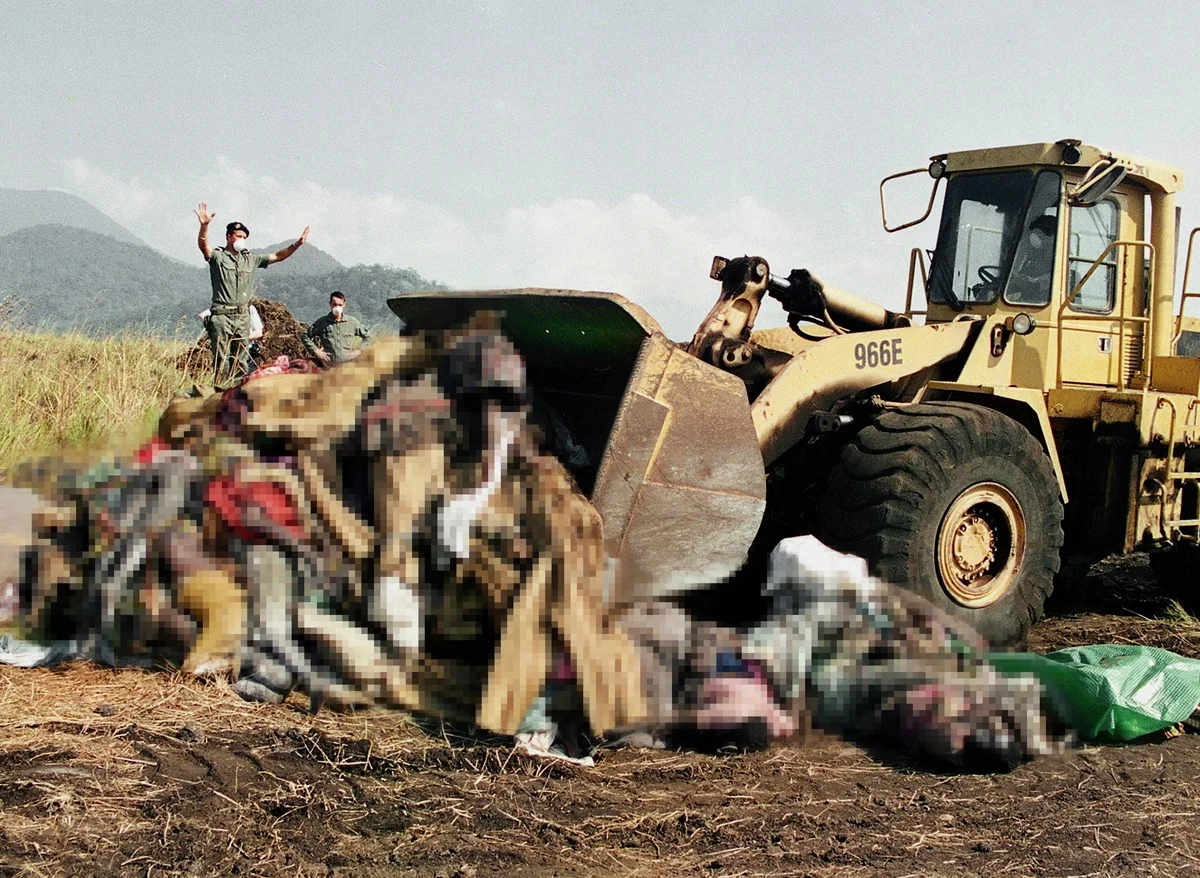 Перед ямами, вырытыми экскаваторами, директор Университетского центра общественного здравоохранения Эжен Рвамучо стоял, вооруженный винтовкой, выданной властями. Он признает, что был с оружием, но уверяет, что «никогда им не пользовался».