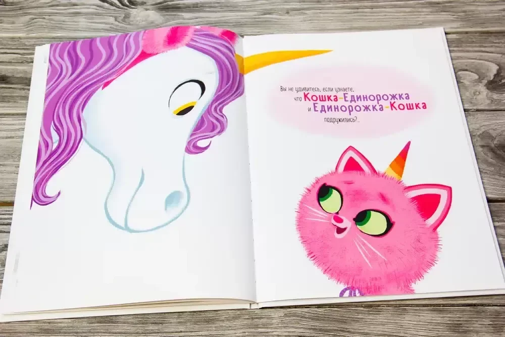 Но, может быть, самая дикая история приключилась с малышовой книжкой Шеннон Хейл «Как котенок стал единорогом». Там изображен маленький розовый котенок, который любуется красивым единорогом — и склеивает из бумаги для себя рог. И стихи в переводе Маши Лукашкиной: