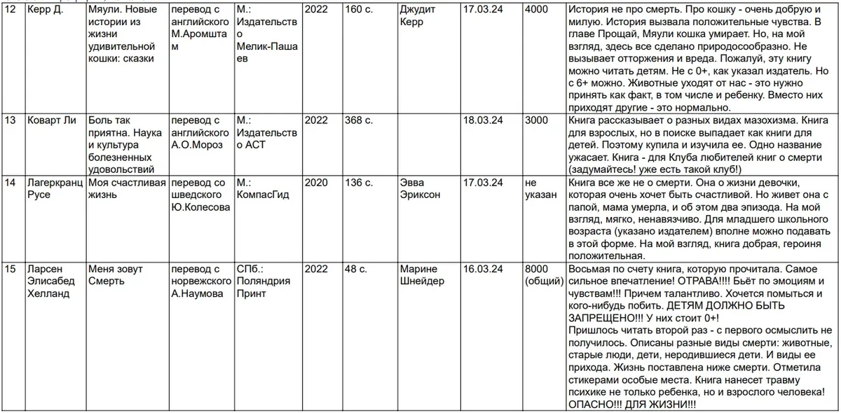 «ОТРАВА!!!! Бьёт по эмоциям и чувствам!!! Причем талантливо. Хочется помыться и кого-нибудь побить. ДЕТЯМ ДОЛЖНО БЫТЬ ЗАПРЕЩЕНО!!! У них стоит 0+! Пришлось читать второй раз — с первого осмыслить не получилось. Описаны разные виды смерти: животные, старые люди, дети, неродившиеся дети. И виды ее прихода. Жизнь поставлена ниже смерти. Отметила стикерами особые места. Книга нанесет травму психике не только ребенка, но и взрослого человека! ОПАСНО!!! ДЛЯ ЖИЗНИ!!!»
