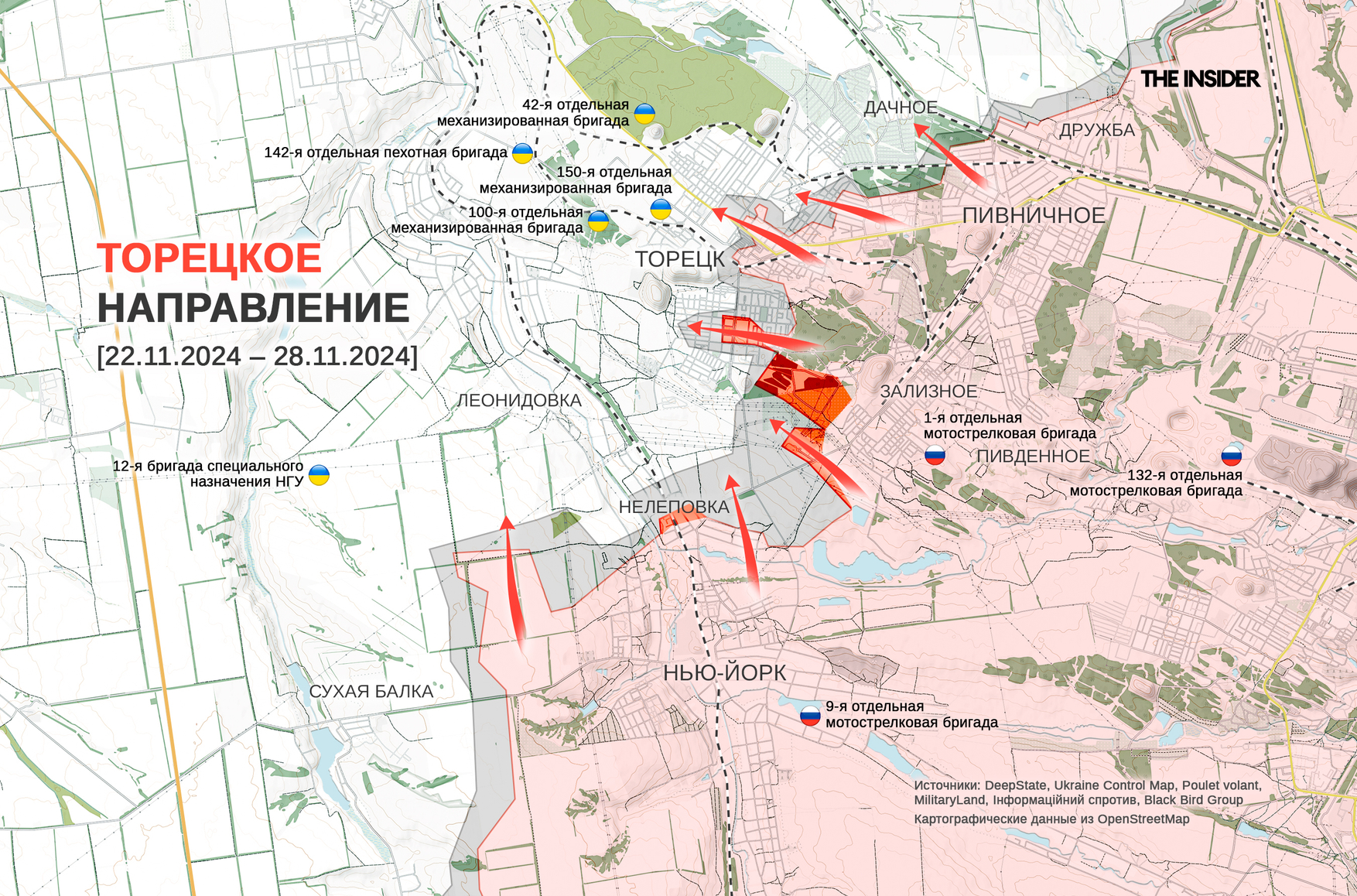 Аналитики DeepState пишут о захвате российскими военными новых позиций в Торецке (до 2016 года — Дзержинск) и к югу от города в Нелеповке. Украинский военнослужащий, ведущий Telegram-канал «Офіцер ✙», сравнивает их с тараканами: «Залезают во все щели, накапливаются и пытаются двигаться таким образом дальше и дальше». Также он жалуется на «про*бы некоторых подразделений ВСУ, где командование не в силах организовать оборону».