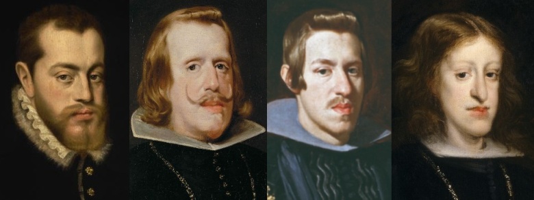 «Габсбургская челюсть» у представителей испанской ветви семейства: король Филипп II (1527–1598), его внук Филипп IV (1605–1665), внучатый племянник Карлос Австрийский (1606–1632) и правнук Карл II (1661–1700)