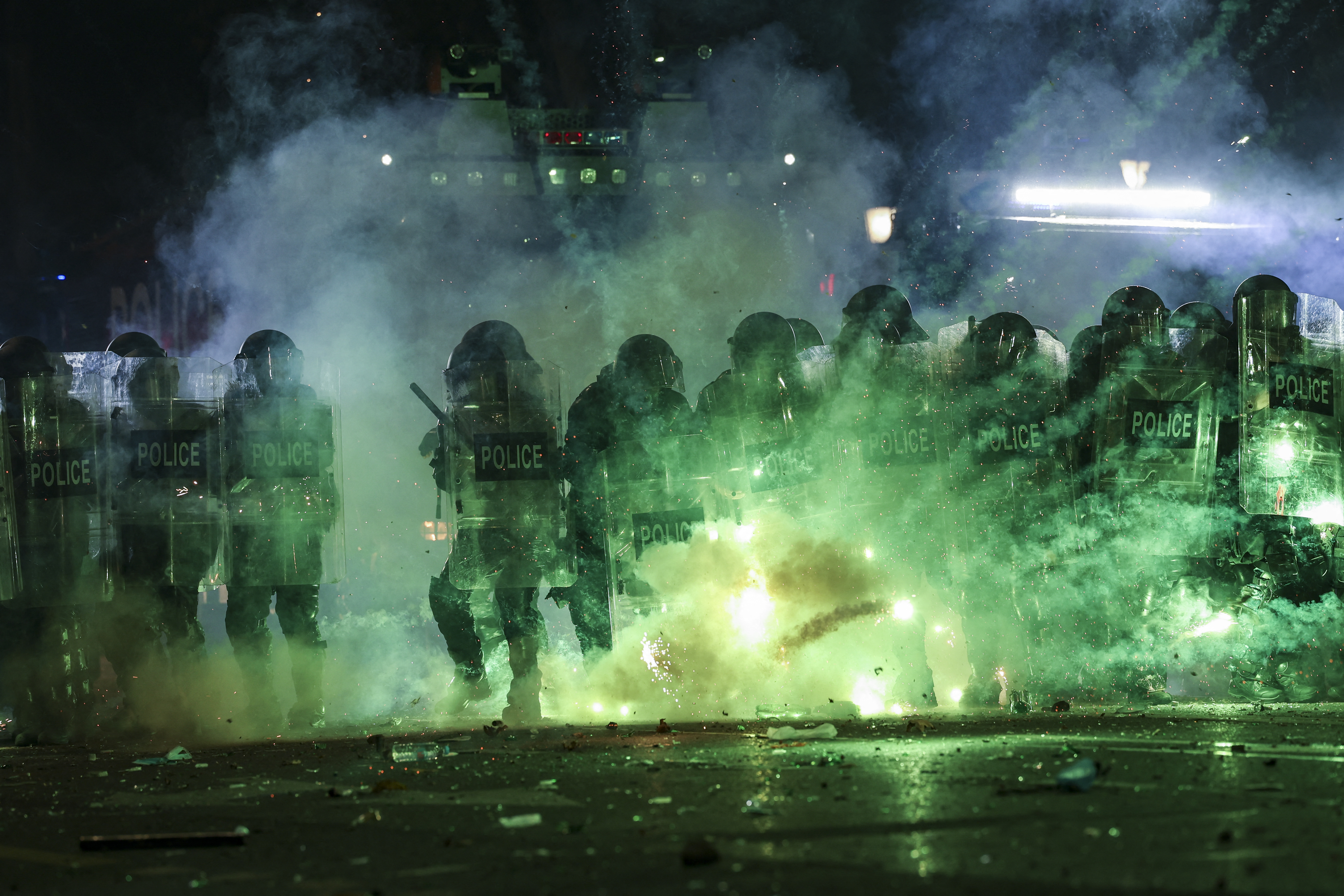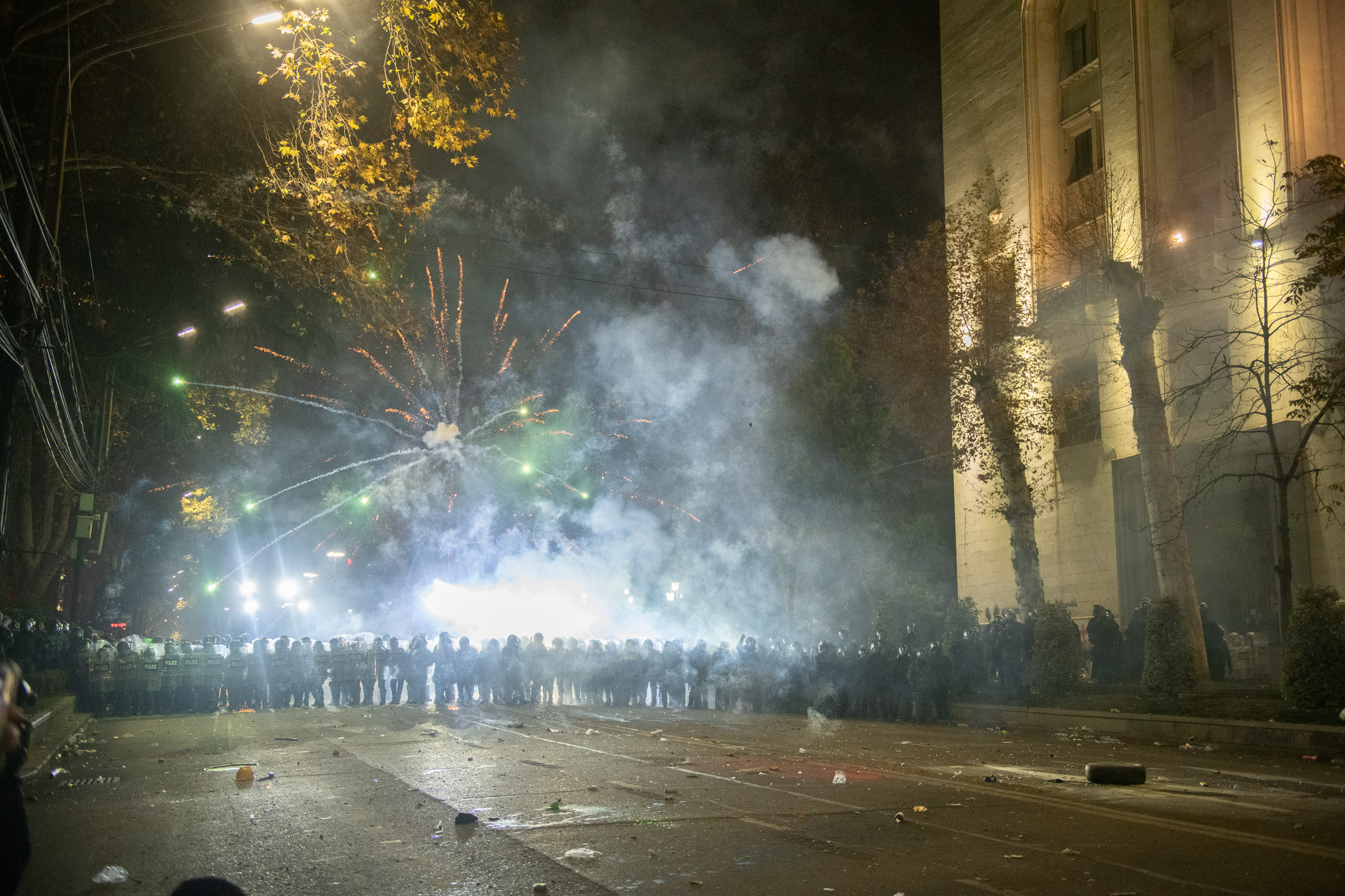 Тем не менее спецназ применяет водометы и перцовый газ. Демонстранты в ответ забрасывают спецназовцев петардами, запускают фейерверки и строят баррикады на проспекте.