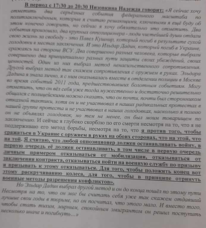 «Я против того, чтобы сражаться в Украине с оружием в руках на обоих сторонах, что на этой, что на той. Я считаю, что любой оппозиционер должен останавливать войну, в том числе личным примером отказываться от мобилизации, заключения контракта, военной службы по призыву и призывать к этому отказываться. Для того, чтобы положить конец вот этому раскручиванию колеса, чтобы отринуть военные методы разрешения конфликтов», — говорится в цитате, которую полиция вменила Низовкина.