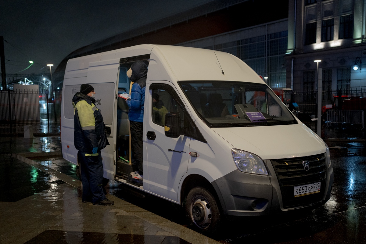 Микроавтобус привозит нас к мобильному пункту обогрева на Киевском вокзале. Всего их в Москве пять: у зданий Ярославского, Павелецкого, Белорусского, Киевского и Курского вокзалов. Мобильные пункты — это микроавтобусы, куда могут прийти бездомные люди на несколько часов — согреться и выпить горячего чаю.