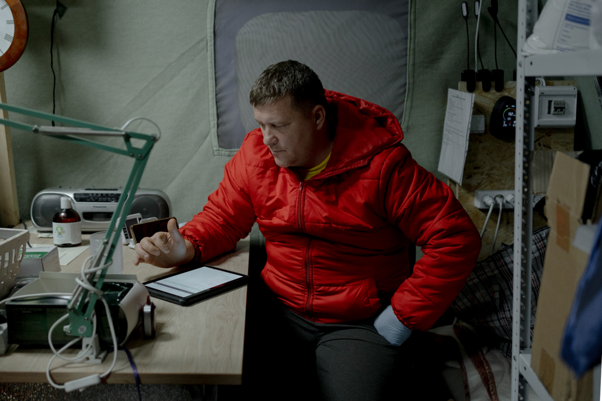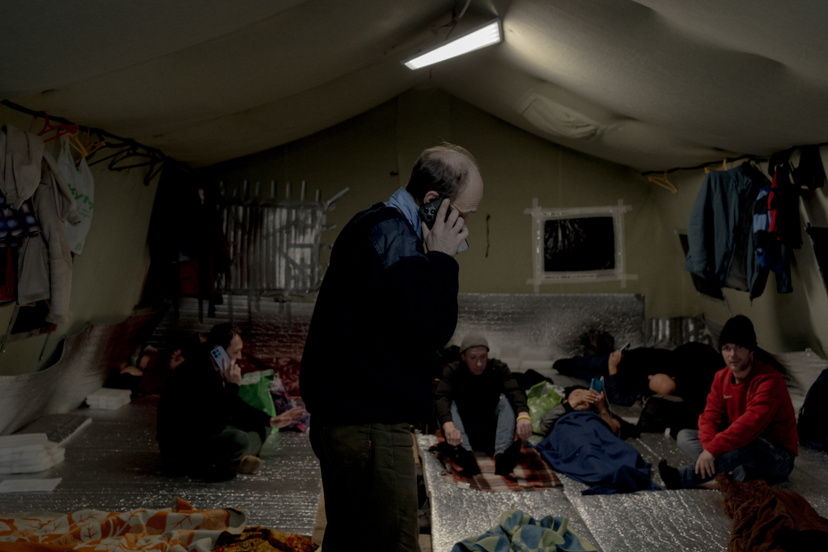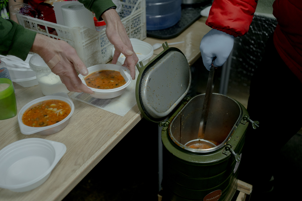 Внутри палатки, кроме пушки, стоит небольшой столик с розетками и кучей проводов: можно зарядить свои телефоны. Несколько человек присели за стол в ожидании горячего супа. «Берите тарелку, аккуратнее», — говорит дежурный пункта Михаил, разливая суп и протягивая тарелки.