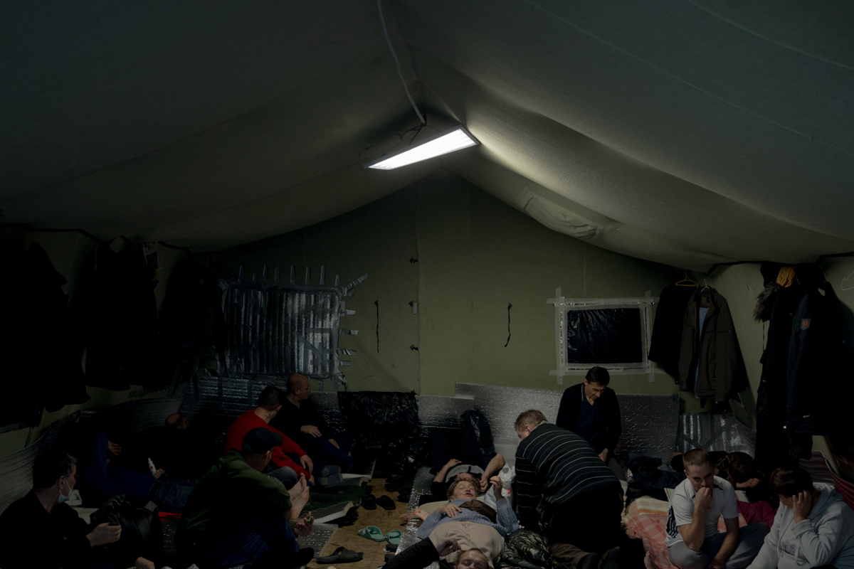 Пункт обогрева «Ночлежки»Фото: Ксения Максимова для ТД Мы добираемся туда почти к девяти вечера. Внутри большой синей палатки к этому времени расположились около 30 бездомных. Кто-то уже лег спать, кто-то просто сидит на подстилках. «Когда в апреле запускался этот пункт, мы с коллегами и волонтерами тут сами переночевали. У нас была большая [тепловая] пушка, но спать было все равно прохладно. Мы поняли, что нужны лежаки, подстилки для сохранения тепла и чтобы было помягче», — поясняет Дарья Байбакова.