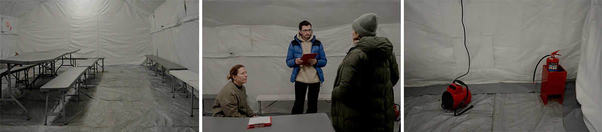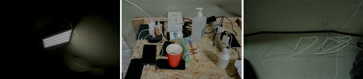 Внутри палатки расставлены белые лавочки, стоит небольшой столик с чайником, чаем и стаканчиками, работает отопительная пушка. С улицы слышен сильный ветер, который с шумом обрушивается на палатку. Людей внутри нет.