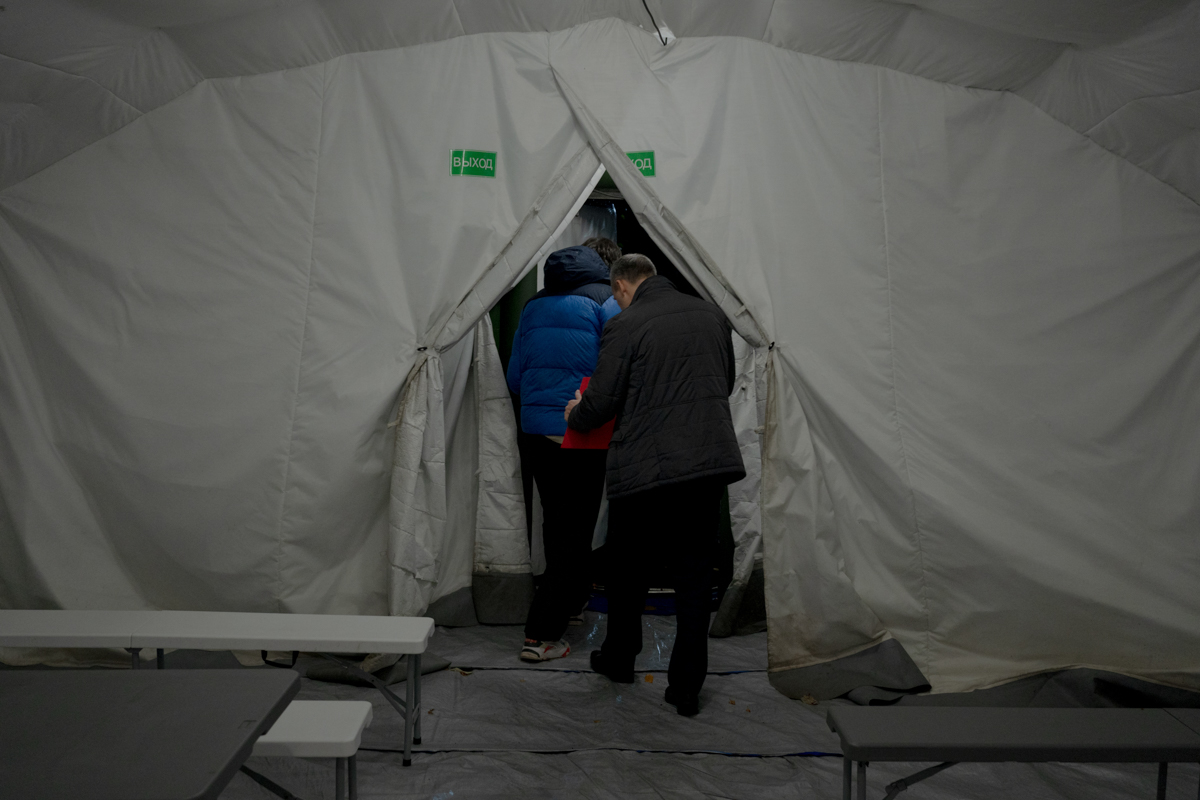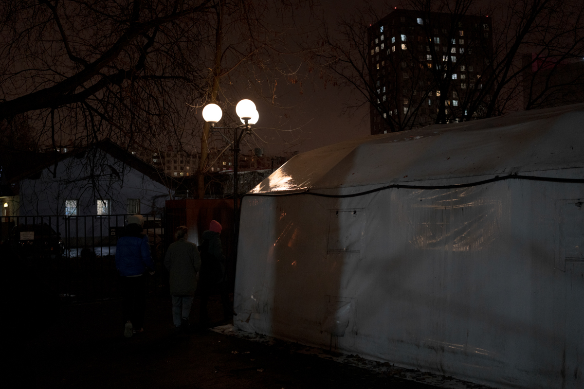 Добираемся до отделения «Косино-Ухтомское» ГКУ «Центр социальной адаптации имени Е. П. Глинки» на восточной окраине Москвы. Здание, огороженное забором, напоминает корпус больницы или пансионата. В глубине территории белеет большая палатка, освещенная яркими фонарями. Это и есть пункт обогрева. Тут нас встречают заместитель директора Центра социальной адаптации Анастасия Чжу, представитель аппарата уполномоченного по правам человека в Москве Антон Штыков, пресс-секретарь департамента труда и социальной защиты населения города Москвы и другие чиновники.