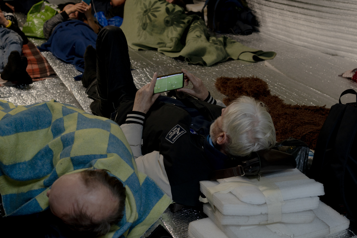 Клиент «Ночлежки» смотрит футбол в пункте обогреваФото: Ксения Максимова для ТД Ирина говорит прямо: в Москве бездомным податься некуда. Гонят с вокзалов и из аэропортов. Бездомные сами подсказывают друг другу, куда можно пойти, чтобы поесть: «Мы между собой друг друга тянем. Мне вот нравится, что открылась эта палатка, но хотелось бы, чтобы их было много. Потому что и нас много».