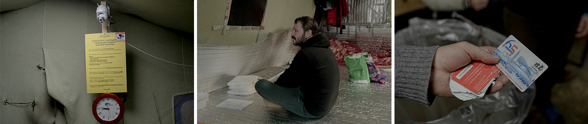 Слева: табличка с правилами посещения пункта обогрева перед входом в палатку «Ночлежки». В центре: Александр, клиент пункта обогрева «Ночлежки». О пункте он узнал через сарафанное радио и говорит, что не представляет, что бы с ним случилось без этого места. Справа: проездной одного из клиентов «Ночлежки». Он проводит в пункте обогрева почти каждую ночь. На дорогу до пункта и обратно у него уходит около 200 рублейФото: Ксения Максимова для ТД По словам Абросимовой, количество людей, обращающихся за помощью в штаб «Ночлежки» в Бумажном проезде, в среднем достигает 50 человек в день. Отстояв очередь за выдачей одежды или предметов личной гигиены, бездомный человек может отправиться на раздачу еды на площадь Трех вокзалов, в 30 минутах езды от «Ночлежки» (обычно за едой каждый день приходят около 80 человек). Получив порцию горячего супа, человек должен преодолеть немалый путь до пункта обогрева. Все они, включая палатку «Ночлежки», находятся на окраинах Москвы: например, от площади Трех вокзалов добираться до них около полутора часов на транспорте.