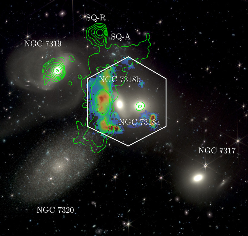 В новом исследовании ученые, измеряя влияние столкновения на систему, обнаружили, что данный «кадр» не после столкновения, а во время него. Одна из галактик — NGC 7318b — всё еще врезается в три остальные. Это открытие стало возможным благодаря объединению недавно полученных данных с новейших приборов — спектрографа WEAVE на телескопе Уильяма Гершеля в Ла-Пальме (Испания) и европейского радиотелескопа LOFAR — с архивными наблюдениями «Джеймса Уэбба» и массива телескопов Very Large Array в США. Результаты исследования опубликованы в журнале Monthly Notices of the Royal Astronomical Society [2].
