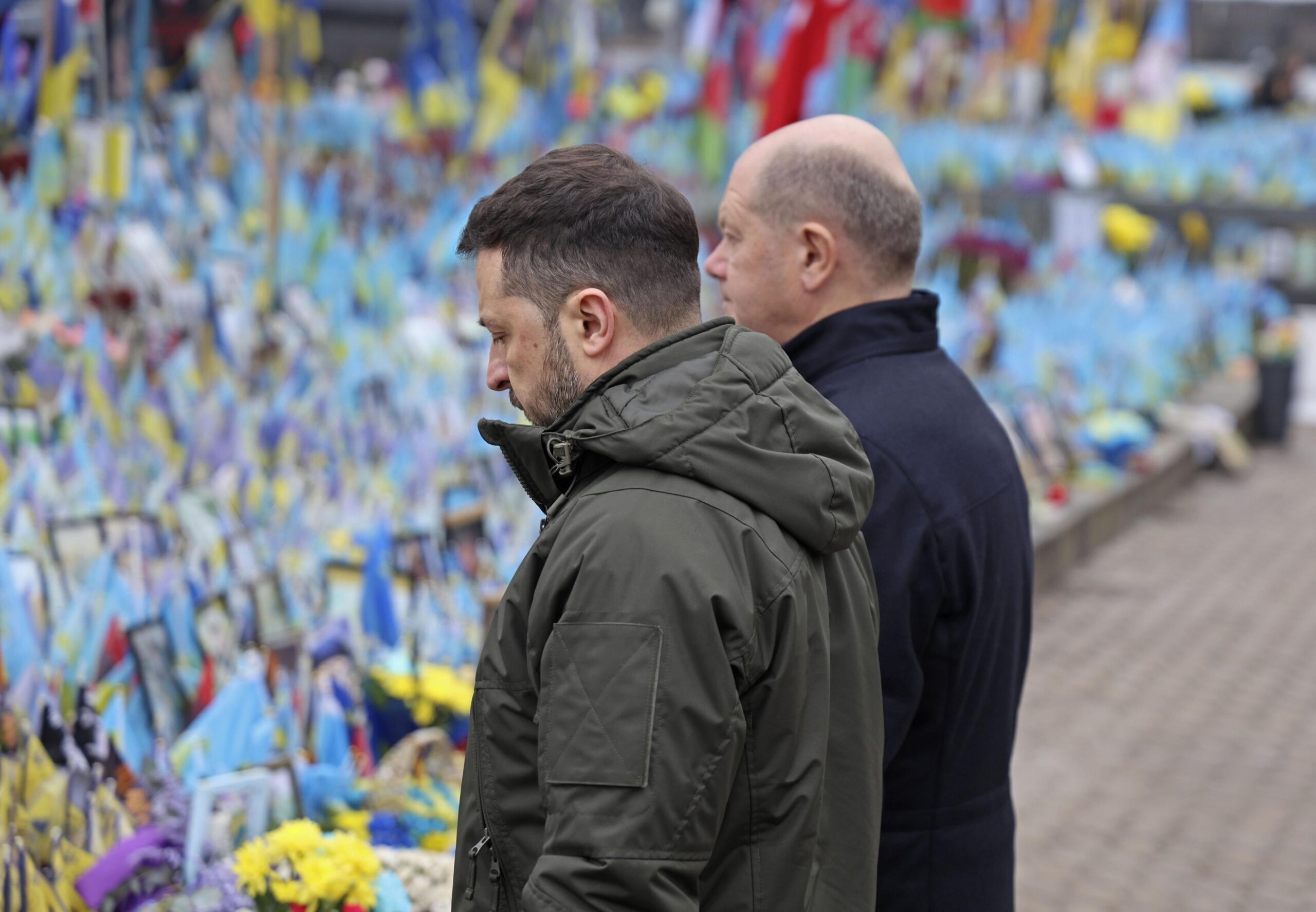 Фото: Канцлер Германии Олаф Шольц и президент Украины Владимир Зеленский у мемориала жертвам войны в Киеве. 2 декабря 2024 года. Kyodo via Reuters Connect