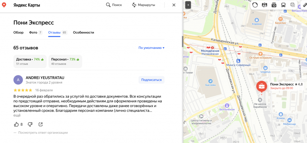 Примечательно также, что пользователь с именем Andrei Yeustratau 16 февраля 2024 году оставил на «Яндекс.Картах» хвалебный комментарий белорусскому сервису доставки Pony Express. И Беларусь возникла тут не случайно.