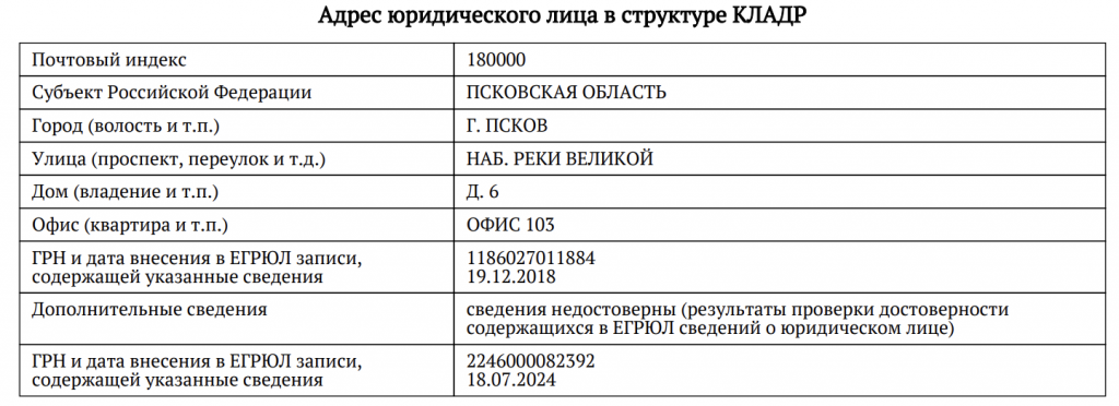 Более того, согласно Единому госреестру юрлиц, в июле 2024 года года Федеральная налоговая служба установила, что сведения об адресе «Псковоргсинтеза» недостоверны.