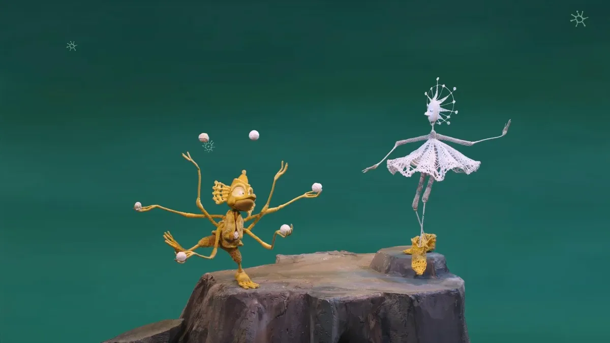Главный приз — тому свидетельство. Его получил обаятельный детский анимационный фильм «Носки для звезды» Ольги Титовой. Некий кружевной многорукий паук-демиург сидит на холодной скале «мироздания» и вывязывает, не жалея ниток, небосвод, отправляет макраме-созвездия в небо: Рыбу, Деву, Быка, Большую Медведицу, пока клубок не закончится. И вскоре «вывяжется» у него розово-белая Звездочка — тоненькая балерина. Танцует она, прыгая с одной ледяной скалы на другую. Холодно в пуантах — во вселенских заморозках. И тогда он свяжет для нее теплые носки. В мультфильме есть еще и немного «конфликта»: образуется черный дракон, но тоже из кружева. И наш рукоделец спасет Звездочку и согреет теплом и лаской.