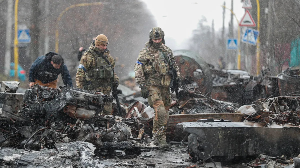 Ukrainian soldiers inspect Russian military hardware abandoned in the Kyiv region town of Bucha, Ukraine, 3 April 2022. Photo: EPA-EFE/ATEF SAFADI