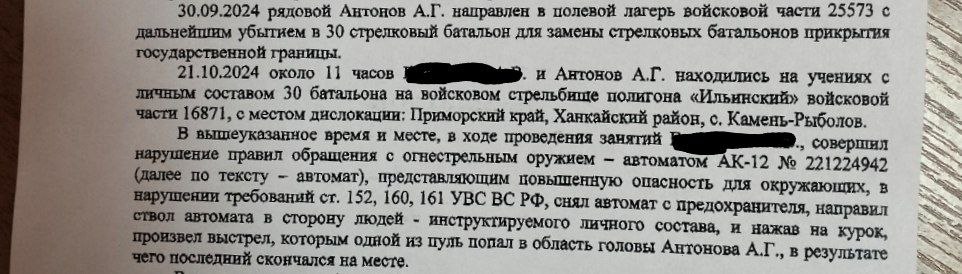 "В вышесказанное время и месте в ходе проведения занятий [лейтенант] совершил нарушение правил обращения с огнестрельным оружием — автоматом АК-12, представляющим повышенную опасность для окружающих, снял автомат с предохранителя, направил ствол автомата в сторону людей — инструктируемого личного состава, и, нажав на курок, произвел выстрел, которым одной из пуль попал в область головы Антонова А.Г., в результате которого последний скончался на месте", — сказано в документе.