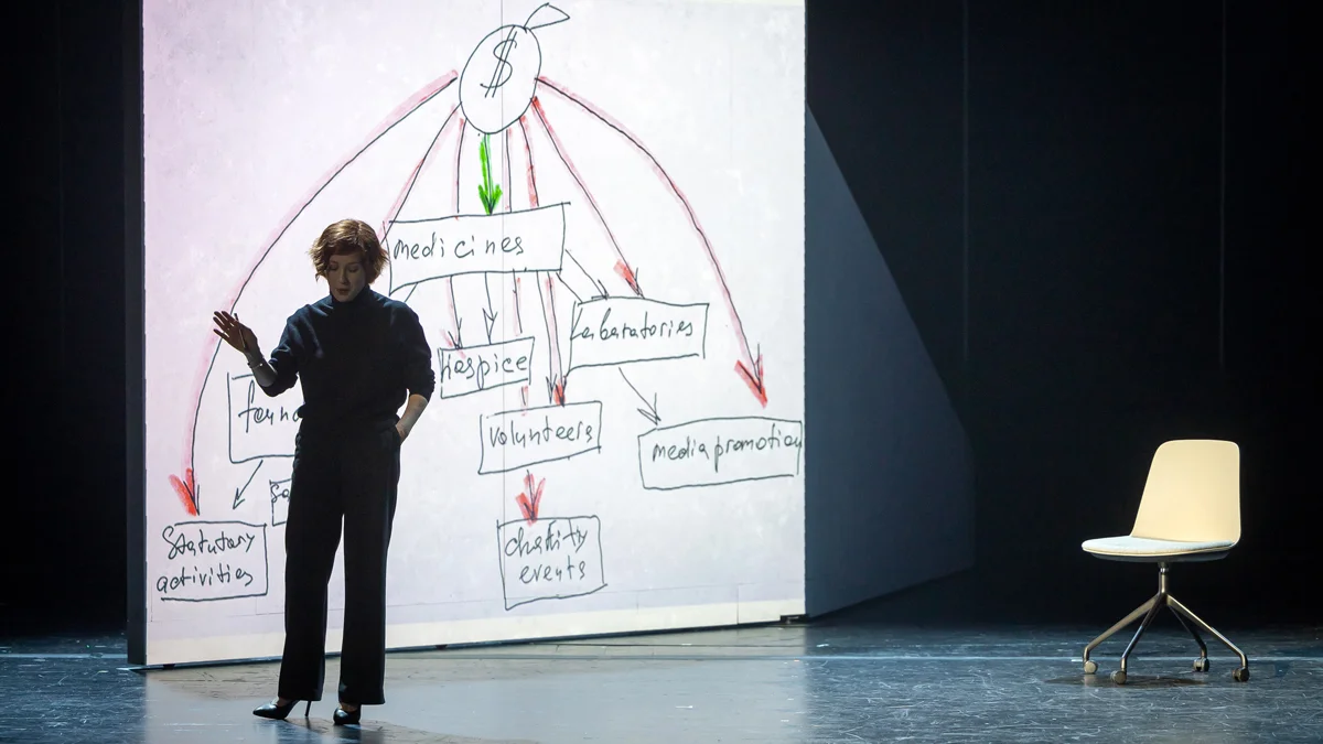 Технически спектакль сделан подчеркнуто безыскусно, хотя его сценография и требует поворотного круга, то есть правильной театральной машинерии. Элмарс Сеньковс, год работавший худруком Латвийского национального театра и много ставивший в рижском Театре Михаила Чехова, в Лиепае и Валмиере, обеспечил актрисам бенефис. К их основным ролям подключены еще и второстепенные персонажи. Особенно активно перевоплощается Хаматова — то в демонического адвоката (карикатурного мерзавца), то в не менее гротескную миллиардершу — главного попечителя фонда.
