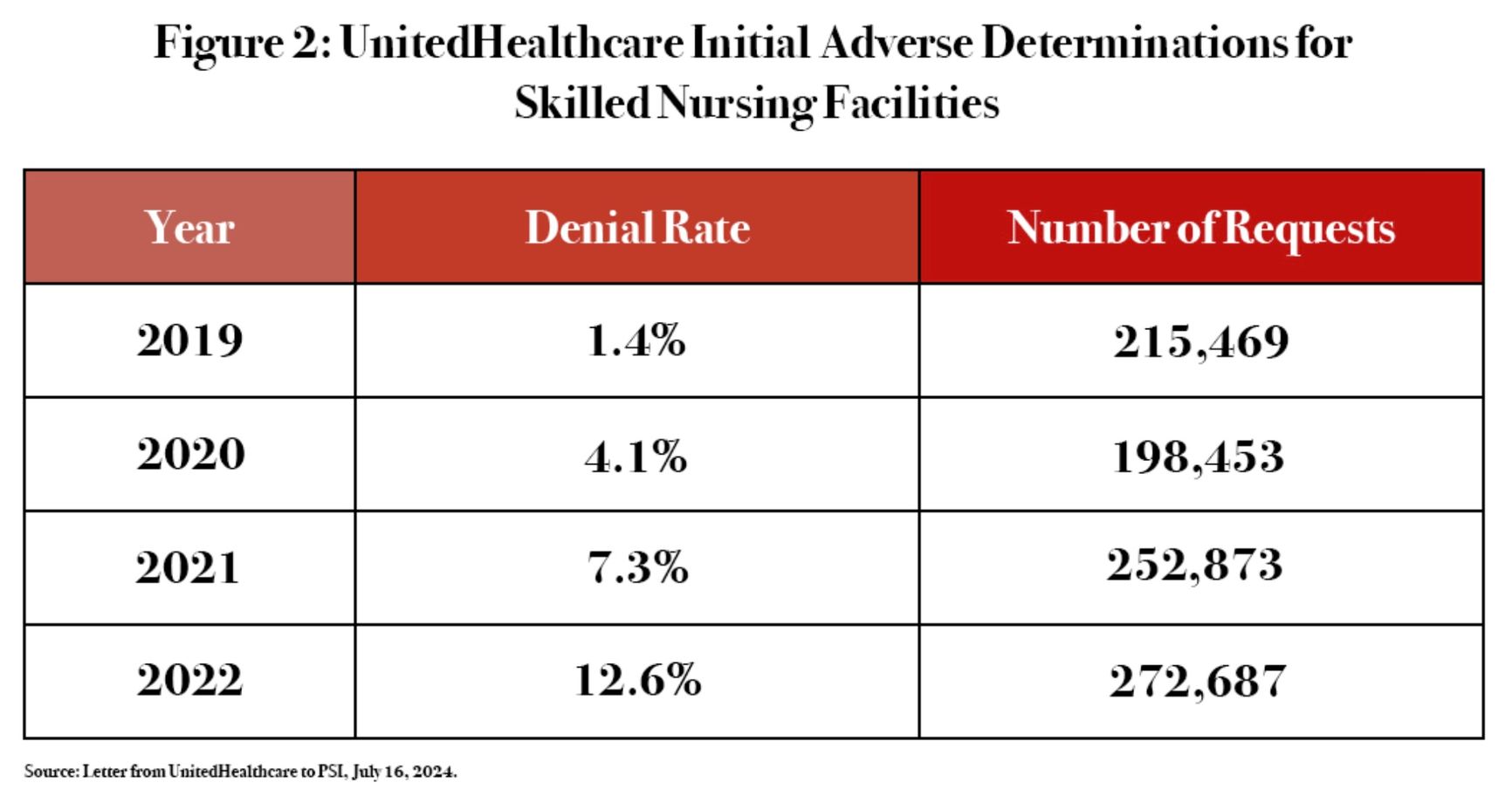 Также оказалось, что резко выросло число отказов в оплате лечения пациентов, которым приходилось долго оставаться в больничных условиях по причине инсульта, — четырем из пяти таких пациентов UnitedHealth отказала в оплате услуг клиник, стоимость которых составляла десятки и даже сотни тысяч долларов.