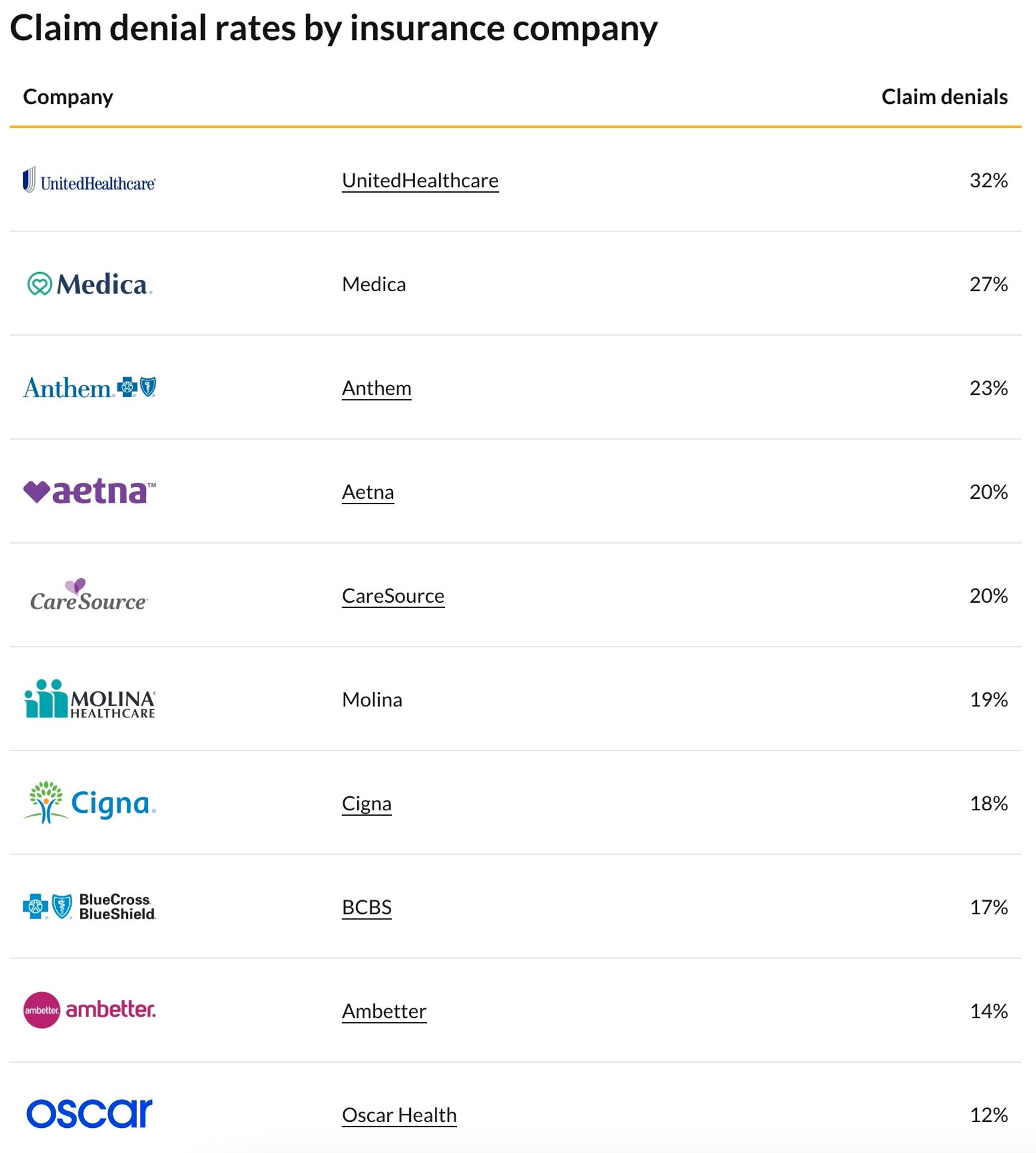 Портал ValuePenguin, который дает индивидуальные консультации по ведению личного бюджета и заработка, ведет собственный рейтинг страховых компаний на основании того, как часто они отказывают пациентам в оплате счетов за лечение. UnitedHealth занимает худшее место в этом рейтинге. По данным ValuePenguin, до трети всех заявок на страховые выплаты получают отказ — это в два раза чаще, чем в среднем по компаниям в отрасли.